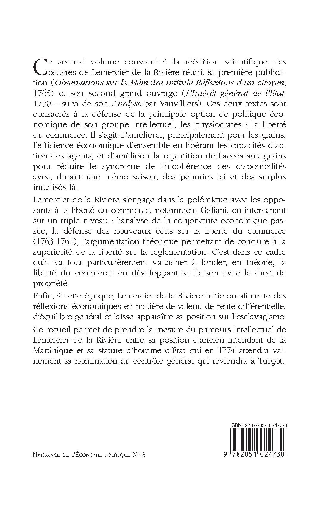 Ce second volume consacré à la réédition scientifique des œuvres de Lemercier de la Rivière réunit sa première publication (« Observations sur le Mémoire intitulé Réflexions d’un citoyen », 1765) et son second grand ouvrage (« L’Intérêt général de l’Etat », 1770 – suivi de son « Analyse » par Vauvilliers). Ces deux textes sont consacrés à la défense de la principale option de politique économique de son groupe intellectuel, les physiocrates : la liberté du commerce. Il s’agit d’améliorer, principalement pour les grains, l’efficience économique d’ensemble en libérant les capacités d’action des agents, et d’améliorer la répartition de l’accès aux grains pour réduire le syndrome de l’incohérence des disponibilités avec, durant une même saison, des pénuries ici et des surplus inutilisés là . Lemercier de la Rivière s’engage dans la polémique avec les opposants à la liberté du commerce, notamment Galiani, en intervenant sur un triple niveau : l’analyse de la conjoncture économique passée, la défense des nouveaux édits sur la liberté du commerce (1763-1764), l’argumentation théorique permettant de conclure à la supériorité de la liberté sur la réglementation. C’est dans ce cadre qu’il va tout particulièrement s’attacher à fonder, en théorie, la liberté du commerce en développant sa liaison avec le droit de propriété. Enfin, à cette époque, Lemercier de la Rivière initie ou alimente des réflexions économiques en matière de valeur, de rente différentielle, d’équilibre général et laisse apparaître sa position sur l’esclavagisme. Ce recueil permet de prendre la mesure du parcours intellectuel de Lemercier de la Rivière entre sa position d’ancien intendant de la Martinique et sa stature d’homme d’Etat qui en 1774 attendra vainement sa nomination au contrôle général qui reviendra à Turgot.