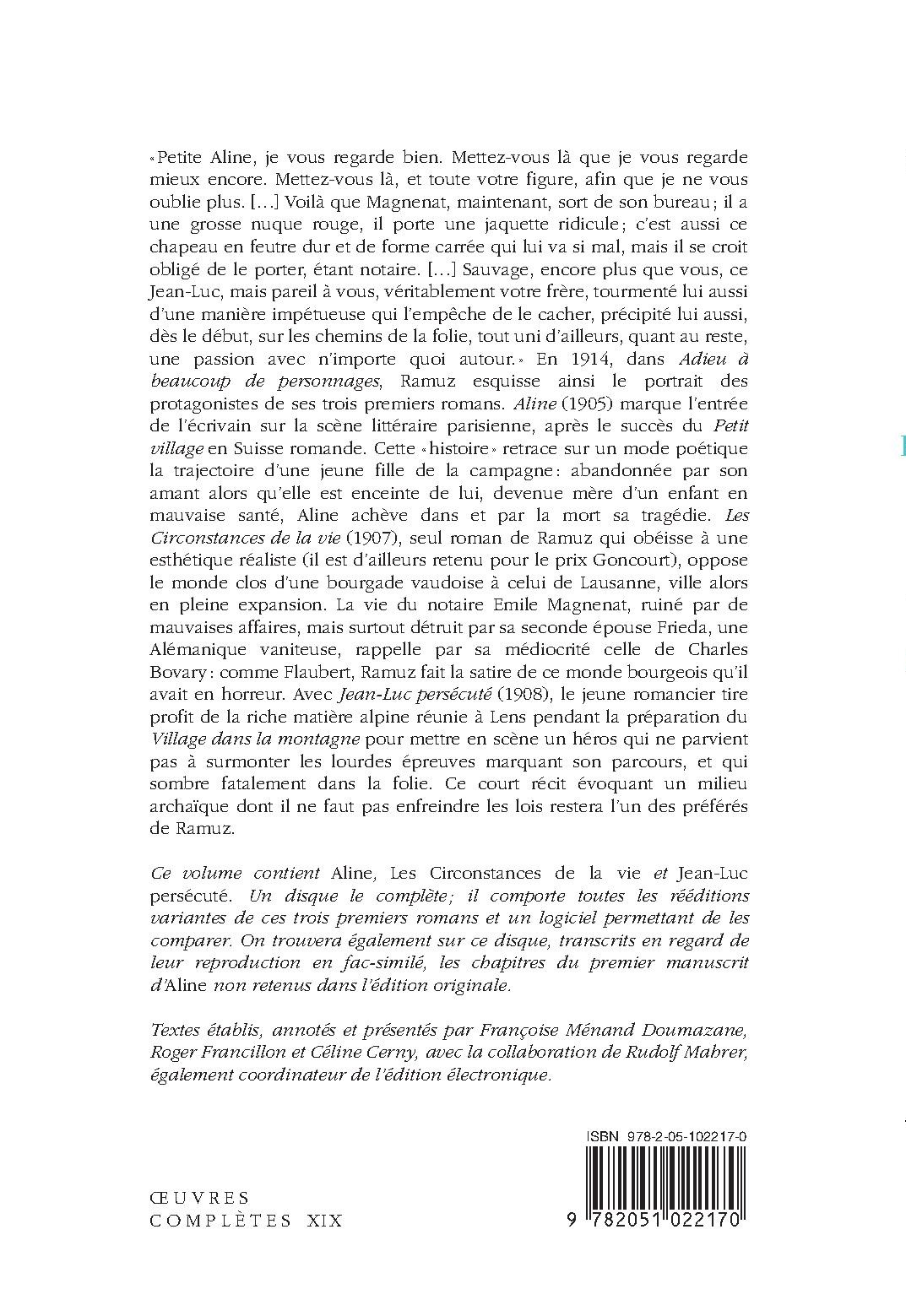 Aline (1905) marque l`entrée de l`écrivain sur la scène littéraire parisienne, après le succès du Petit village en Suisse romande. Cette " histoire " retrace sur un mode poétique la trajectoire d`une jeune fille de la campagne : abandonnée par son amant alors qu`elle est enceinte de lui, devenue mère d`un enfant en mauvaise santé, Aline achève dans et par la mort sa tragédie. Les Circonstances de la vie (1907), seul roman de Ramuz qui obéisse à une esthétique réaliste (il est d`ailleurs retenu pour le prix Goncourt), oppose le monde clos d`une bourgade vaudoise à celui de Lausanne, ville alors en pleine expansion. La vie du notaire Emile Magnenat, ruiné par de mauvaises affaires, mais surtout détruit par sa seconde épouse Frieda, une Alémanique vaniteuse, rappelle par sa médiocrité celle de Charles Bovary: comme Flaubert, Ramuz fait la satire de ce monde bourgeois qu`il avait en horreur. Avec Jean-Luc persécuté (1908), le jeune romancier tire profit de la riche matière alpine réunie à Lens pendant la préparation du Village dans la montagne pour mettre en scène un héros qui ne parvient pas à surmonter les lourdes épreuves marquant son parcours, et qui sombre fatalement dans la folie. Ce court récit évoquant un milieu archaïque dont il ne faut pas enfreindre les lois restera l`un des préférés de Ramuz. Ce volume contient Aline, Les Circonstances de la vie et Jean-Luc persécuté. Un disque le complète; il comporte toutes les rééditions variantes de ces trois premiers romans et un logiciel permettant de les comparer. On trouvera également sur ce disque, transcrits en regard de leur reproduction en fac-similé, les chapitres du premier manuscrit d`Aline non retenus dans l`édition originale.