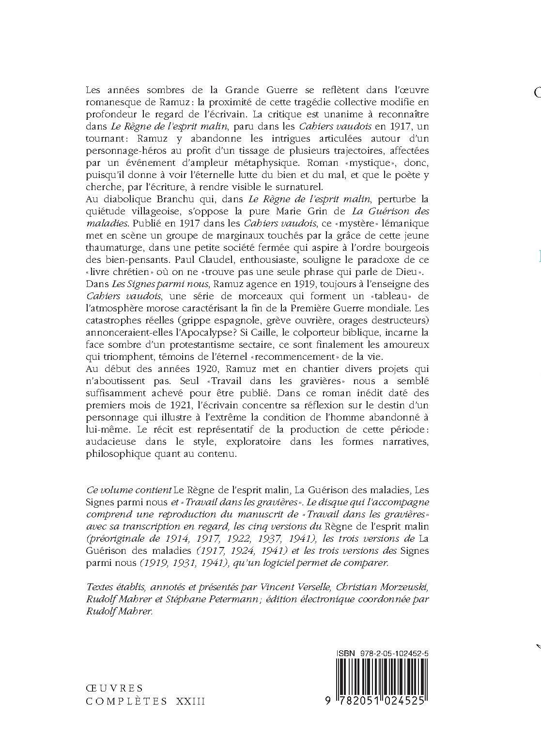 Les années sombres de la Grande Guerre se reflètent dans l’œuvre romanesque de Ramuz: la proximité de cette tragédie collective modifie en profondeur le regard de l’écrivain. La critique est unanime à reconnaître dans Le Règne de l’esprit malin, paru dans les Cahiers vaudois en 1917, un tournant: Ramuz y abandonne les intrigues articulées autour d’un personnage-héros au profit d’un tissage de plusieurs trajectoires, affectées par un événement d’ampleur métaphysique. Roman «mystique », donc, puisqu’il donne à voir l’éternelle lutte du bien et du mal, et que le poète y cherche, par l’écriture, à rendre visible le surnaturel. Au diabolique Branchu qui, dans Le Règne de l’esprit malin, perturbe la quiétude villageoise, s’oppose la pure Marie Grin de La Guérison des maladies. Publié en 1917 dans les Cahiers vaudois, ce «mystère » lémanique met en scène un groupe de marginaux touchés par la grâce de cette jeune thaumaturge, dans une petite société fermée qui aspire à l’ordre bourgeois des bien-pensants. Paul Claudel, enthousiaste, souligne le paradoxe de ce « livre chrétien » où on ne « trouve pas une seule phrase qui parle de Dieu ». Dans Les Signes parmi nous, Ramuz agence en 1919, toujours à l’enseigne des Cahiers vaudois, une série de morceaux qui forment un «tableau» de l’atmosphère morose caractérisant la fin de la Première Guerre mondiale. Les catastrophes réelles (grippe espagnole, grève ouvrière, orages destructeurs) annonceraient-elles l’Apocalypse ? Si Caille, le colporteur biblique, incarne la face sombre d’un protestantisme sectaire, ce sont finalement les amoureux qui triomphent, témoins de l’éternel « recommencement» de la vie. Au début des années 1920, Ramuz met en chantier divers projets qui n’aboutissent pas. Seul «Travail dans les gravières» nous a semblé suffisamment achevé pour être publié. Dans ce roman inédit daté des premiers mois de 1921, l’écrivain concentre sa réflexion sur le destin d’un personnage qui illustre à l’extrême la condition de l’homme abandonné à lui-même.