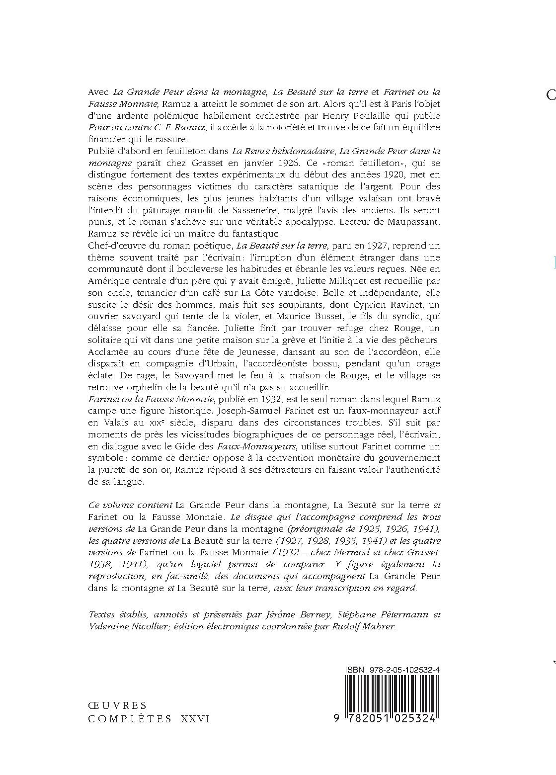 Avec "La Grande Peur dans la montagne" (1925), "La Beauté sur la terre" (1928) et "Farinet ou la Fausse Monnaie" (1932), Ramuz a atteint le sommet de son art ; il a aussi établi solidement sa notoriété parisienne. Roman tragique de la montagne, "La Grande Peur" s’achève sur une sorte d’apocalypse. Chef-d’œuvre du roman poétique, "La Beauté sur la terre" repose sur le mystère de Juliette qui, venue des îles d’Amérique centrale, bouleverse une bourgade des bords du lac, affole les hommes de tout âge et disparaît en ne laissant que ruines derrière elle. Farinet, le faux-monnayeur, défend l’authenticité de son or, comme Ramuz bataille sur le plan esthétique pour imposer sa langue-geste.