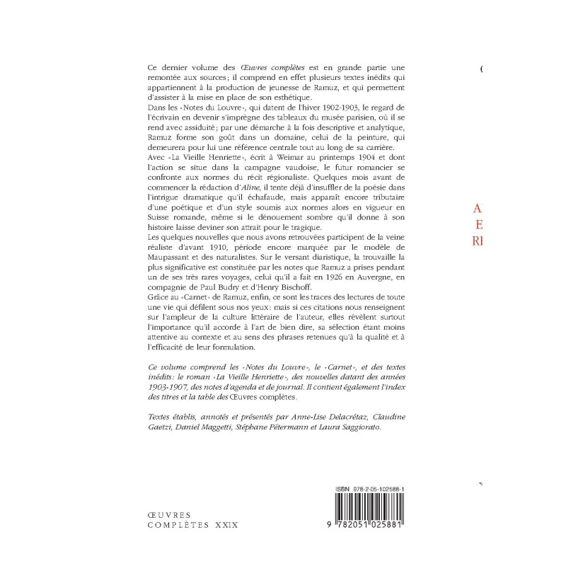 Ce dernier volume des « Œuvres complètes » est en grande partie une remontée aux sources ; il comprend en effet plusieurs textes inédits qui appartiennent à la production de jeunesse de Ramuz, et qui permettent d’assister à la mise en place de son esthétique. Dans les « Notes du Louvre », qui datent de l’hiver 1902-1903, le regard de l’écrivain en devenir s’imprègne des tableaux du musée parisien, où il se rend avec assiduité ; par une démarche à la fois descriptive et analytique, Ramuz forme son goût dans un domaine, celui de la peinture, qui demeurera pour lui une référence centrale tout au long de sa carrière. Avec « La Vieille Henriette », écrit à Weimar au printemps 1904 et dont l’action se situe dans la campagne vaudoise, le futur romancier se confronte aux normes du récit régionaliste. Quelques mois avant de commencer la rédaction d’Aline, il tente déjà d’insuffler de la poésie dans l’intrigue dramatique qu’il échafaude, mais apparaît encore tributaire d’une poétique et d’un style soumis aux normes alors en vigueur en Suisse romande, même si le dénouement sombre qu’il donne à son histoire laisse deviner son attrait pour le tragique. Les quelques nouvelles que nous avons retrouvées participent de la veine réaliste d’avant 1910, période encore marquée par le modèle de Maupassant et des naturalistes. Grâce au « Carnet » de Ramuz, enfin, ce sont les traces des lectures de toute une vie qui défilent sous nos yeux : mais si ces citations nous renseignent sur l’ampleur de la culture littéraire de l’auteur, elles révèlent surtout l’importance qu’il accorde à l’art de bien dire, sa sélection étant moins attentive au contexte et au sens des phrases retenues qu’à la qualité et à l’efficacité de leur formulation. Ce volume contient également l’index des titres et la table des « Œuvres complètes ».
