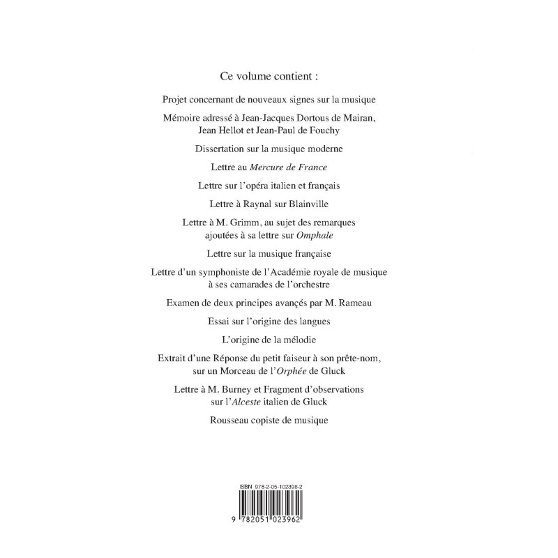Projet concernant de nouveaux signes sur la musique; Mémoire adressé à Jean-Jacques Dortous de Mairan, Jean Hellot et Jean-Paul de Fouchy; Dissertation sur la musique moderne; Lettre au "Mercure de france"; Lettre sur l`opéra italien et français; Lettre à Raynal sur Blainville; Lettre à M. Grimm, au sujet des remarques ajoutées à sa lettre sur "Omphale"; Lettre sur la musique française; Lettre d`un symphoniste de l`Académie royale de musique à ses camarades de l`orchestre; Examen de deux prinicpes avançés par M. Rameau; Essai sur l`origine des langues; L`origine de la mélodie; Extrait d`une Réponse du petit faiseru à son prête-nom, sur un Morceau de l`"Orphée" de Gluck; Lettre à M. Burney et Fragment d`observations sur l`"Alceste" italien de Gluck; Rousseau copiste de musique