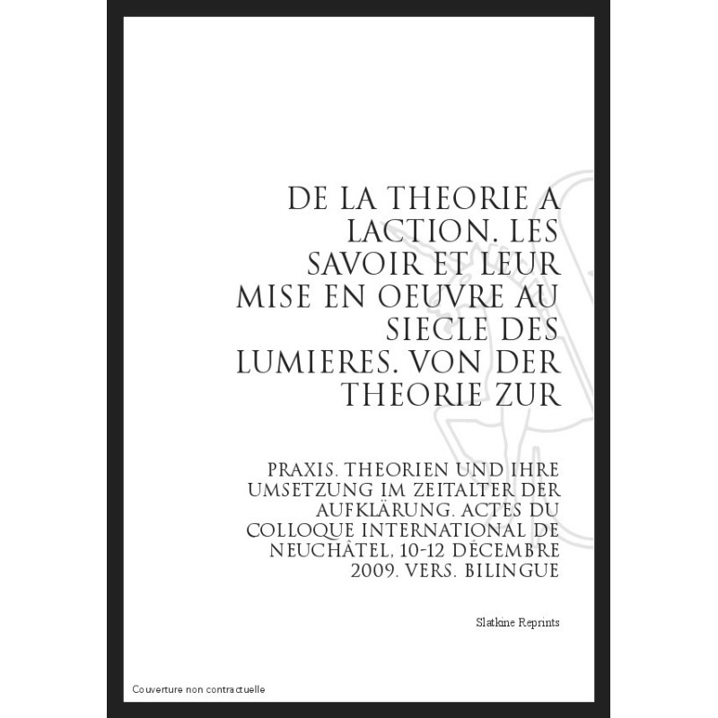 Le rapport du savoir à l`action absorbe une portion importante de la réflexion des Lumières européennes. Dans sa dimension idéalisée, la figure du philosophe recouvre celle d`un législateur, d`un conseiller des princes. Au début de la Révolution française, l`idée s`impose même que la Loi, définie par la Raison, doit régner d`elle-même, jusqu`à rendre l`exécutif presque inutile ; cet idéal connaîtra rapidement le désenchantement, que sanctionnent le Consulat puis l`Empire. - Tous les domaines de la pratique soulèvent un intérêt nouveau : les secteurs les plus prosaïques de la technique, du faire, jadis méprisés au nom de la suprématie des arts libéraux, acquièrent une dignité nouvelle. L`Encyclopédie leur accorde une place fondamentale. Bref, l`impact de la théorie a fait l`objet d`intenses débats, que reflètent les interventions pluridisciplinaires présentées lors du colloque De la théorie à l`action. Les savoirs et leur mise en œuvre au siècle des Lumières (Neuchâtel, Hôtel Du Peyrou, 10-12 décembre 2009). Les différents articles proposés dans ce recueil montrent en outre à quel point les savants suisses participent activement à la réflexion intellectuelle de leur époque, faisant ainsi du territoire helvétique une caisse de résonnance des Lumières européennes (…)