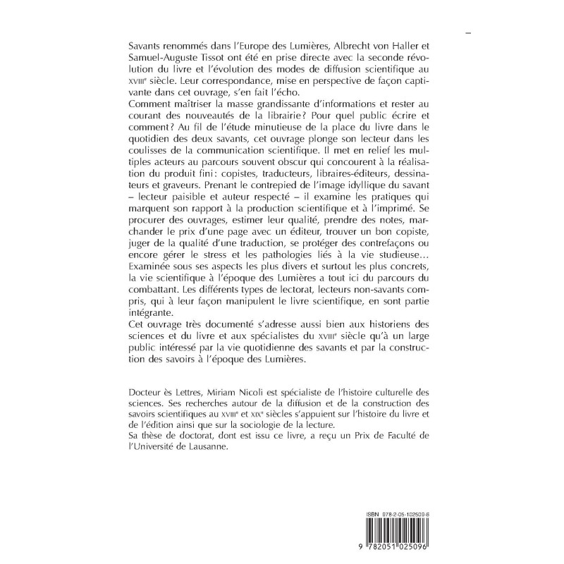 Savants renommés dans l’Europe des Lumières, Albrecht von Haller et Samuel-Auguste Tissot ont été en prise directe avec la seconde révolution du livre et l’évolution des modes de diffusion scientifique au XVIIIe siècle. Leur correspondance, mise en perspective de façon captivante dans cet ouvrage, s’en fait l’écho. Comment maîtriser la masse grandissante d’informations et rester au courant des nouveautés de la librairie ? Pour quel public écrire et comment? Au fil de l’étude minutieuse de la place du livre dans le quotidien des deux savants, cet ouvrage plonge son lecteur dans les coulisses de la communication scientifique. Il met en relief les multiples acteurs au parcours souvent obscur qui concourent à la réalisation du produit fini : copistes, traducteurs, libraires- éditeurs, dessinateurs et graveurs. Prenant le contrepied de l’image idyllique du savant – lecteur paisible et auteur respecté – il examine les pratiques qui marquent son rapport à la production scientifique et à l’imprimé. Se procurer des ouvrages, estimer leur qualité, prendre des notes, marchander le prix d’une page avec un éditeur, trouver un bon copiste, juger de la qualité d’une traduction, se protéger des contrefaçons ou encore gérer le stress et les pathologies liés à la vie studieuse… Examinée sous ses aspects les plus divers et surtout les plus concrets, la vie scientifique à l’époque des Lumières a tout ici du parcours du combattant. Les différents types de lectorat, lecteurs non-savants compris, qui à leur façon manipulent le livre scientifique, en sont partie intégrante.