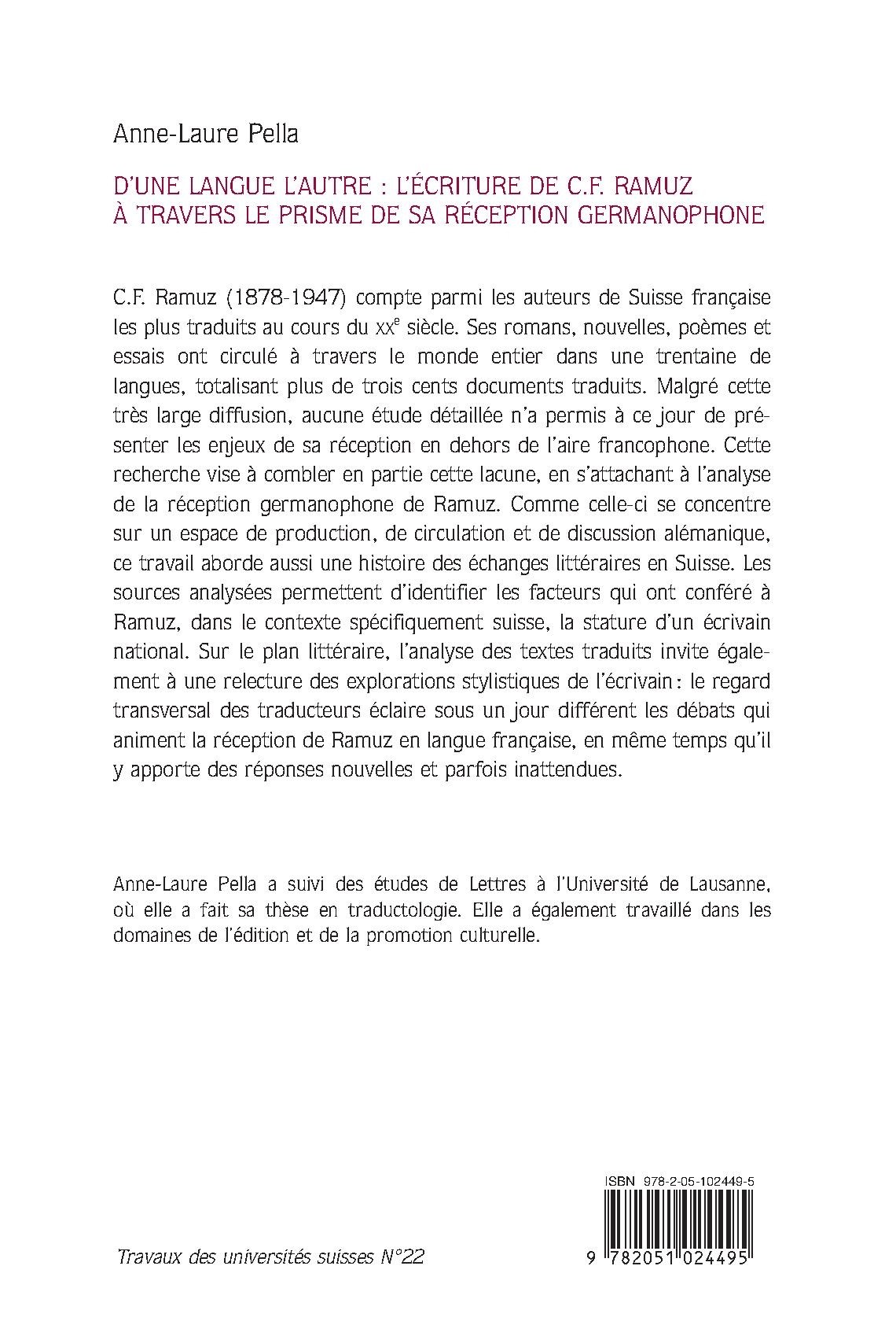 C.F. Ramuz (1878-1947) compte parmi les auteurs de Suisse française les plus traduits au cours du XXe siècle. Ses romans, nouvelles, poèmes et essais ont circulé à travers le monde entier dans une trentaine de langues, totalisant plus de trois cents documents traduits. Malgré cette très large diffusion, aucune étude détaillée n’a permis à ce jour de présenter les enjeux de sa réception en dehors de l’aire francophone. Cette recherche vise à combler en partie cette lacune, en s’attachant à l’analyse de la réception germanophone de Ramuz. Comme celle-ci se concentre sur un espace de production, de circulation et de discussion alémanique, ce travail aborde aussi une histoire des échanges littéraires en Suisse. Les sources analysées permettent d’identifier les facteurs qui ont conféré à Ramuz, dans le contexte spécifiquement suisse, la stature d’un écrivain national. Sur le plan littéraire, l’analyse des textes traduits invite également à une relecture des explorations stylistiques de l’écrivain : le regard transversal des traducteurs éclaire sous un jour différent les débats qui animent la réception de Ramuz en langue française, en même temps qu’il y apporte des réponses nouvelles et parfois inattendues. Anne-Laure Pella a suivi des études de Lettres à l’Université de Lausanne, où elle a fait sa thèse en traductologie. Elle a également travaillé dans les domaines de l’édition et de la promotion culturelle.