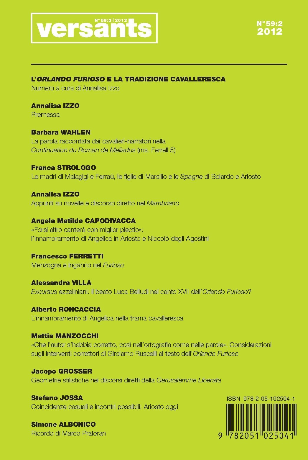 L’ORLANDO FURIOSO E LA TRADIZIONE CAVALLERESCA Numero a cura di Annalisa Izzo Annalisa IZZO Premessa Barbara WAHLEN La parola raccontata dai cavalieri-narratori nella Continuation du Roman de Meliadus (ms. Ferrell 5) Franca STROLOGO Le madri di Malagigi e Ferraù, le fi glie di Marsilio e le Spagne di Boiardo e Ariosto Annalisa IZZO Appunti su novelle e discorso diretto nel Mambriano Angela Matilde CAPODIVACCA «Forsi altro canterà con miglior plectio»: l’innamoramento di Angelica in Ariosto e Niccolò degli Agostini Francesco FERRETTI Menzogna e inganno nel Furioso Alessandra VILLA Excursus ezzeliniani: il beato Luca Belludi nel canto XVII dell’Orlando Furioso? Alberto RONCACCIA L’innamoramento di Angelica nella trama cavalleresca Mattia MANZOCCHI «Che l’autor s’habbia corretto, così nell’ortografi a come nelle parole». Considerazioni sugli interventi correttori di Girolamo Ruscelli al testo dell’Orlando Furioso Jacopo GROSSER Geometrie stilistiche nei discorsi diretti della Gerusalemme Liberata Stefano JOSSA Coincidenze casuali e incontri possibili: Ariosto oggi Simone ALBONICO Ricordo di Marco Praloran
