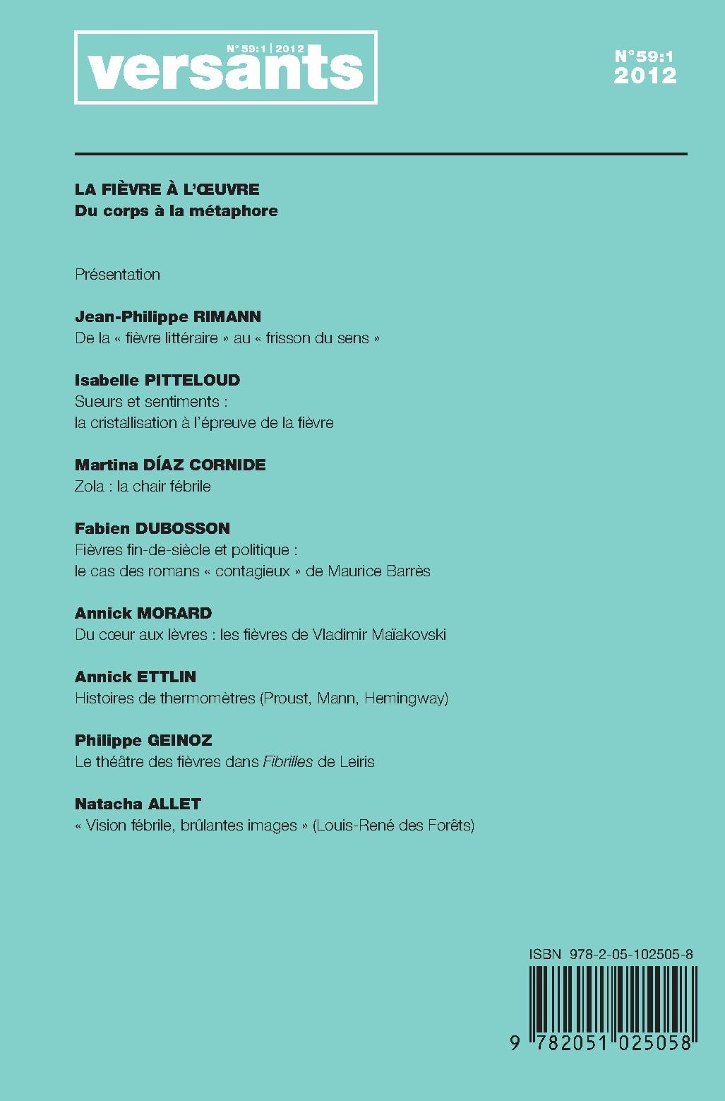 LA FIÈVRE À L’OEUVRE Du corps à la métaphore Présentation Jean-Philippe RIMANN De la « fièvre littéraire » au « frisson du sens » Isabelle PITTELOUD Sueurs et sentiments : la cristallisation à l’épreuve de la fièvre Martina DÍAZ CORNIDE Zola : la chair fébrile Fabien DUBOSSON Fièvres fi n-de-siècle et politique : le cas des romans « contagieux » de Maurice Barrès Annick MORARD Du cœur aux lèvres : les fièvres de Vladimir Maïakovski Annick ETTLIN Histoires de thermomètres (Proust, Mann, Hemingway) Philippe GEINOZ Le théâtre des fièvres dans Fibrilles de Leiris Natacha ALLET « Vision fébrile, brûlantes images » (Louis-René des Forêts)