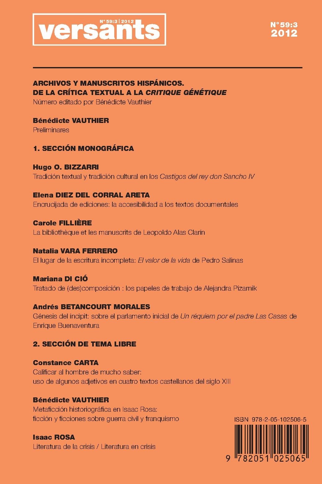 Número editado por Bénédicte Vauthier Bénédicte VAUTHIER Preliminares 1. SECCIÓN MONOGRÁFICA Hugo O. BIZZARRI Tradición textual y tradición cultural en los Castigos del rey don Sancho IV Elena DIEZ DEL CORRAL ARETA Encrucijada de ediciones: la accesibilidad a los textos documentales Carole FILLIÈRE La bibliothèque et les manuscrits de Leopoldo Alas Clarín Natalia VARA FERRERO El lugar de la escritura incompleta: El valor de la vida de Pedro Salinas Mariana DI CIÓ Tratado de (des)composición : los papeles de trabajo de Alejandra Pizarnik Andrés BETANCOURT MORALES Génesis del íncipit: sobre el parlamento inicial de Un réquiem por el padre Las Casas de Enrique Buenaventura 2. SECCIÓN DE TEMA LIBRE Constance CARTA Calificar al hombre de mucho saber: uso de algunos adjetivos en cuatro textos castellanos del siglo XIII Bénédicte VAUTHIER Metaficción historiográfica en Isaac Rosa: ficción y ficciones sobre guerra civil y franquismo Isaac ROSA Literatura de la crisis / Literatura en crisis