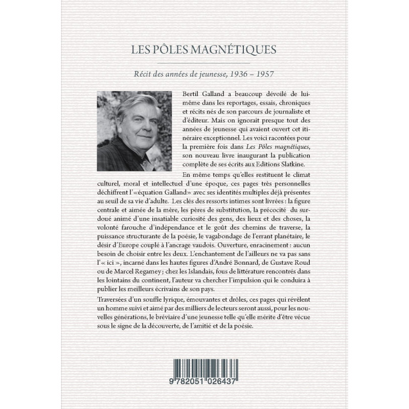 Bertil Galland a beaucoup révélé de lui-même dans les reportages, les essais, les chroniques et les livres nés de son parcours de journaliste et d’éditeur. Mais on ignorait presque tout des années de jeunesse qui avaient ouvert ce parcours exceptionnel. Les voici racontées pour la première fois dans Les Pôles magnétiques, son nouveau livre inaugurant la publication complète de ses écrits aux Editions Slatkine.