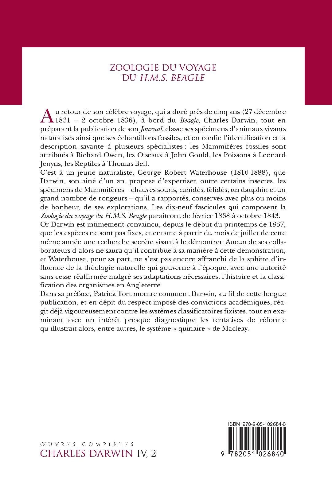 C’est à un jeune naturaliste, George Robert Waterhouse (1810-1888), que Darwin, son aîné d’un an, propose d’expertiser, outre certains insectes, les spécimens de Mammifères – chauves-souris, canidés, félidés, un dauphin et un grand nombre de rongeurs – qu’il a rapportés, conservés avec plus ou moins de bonheur, de ses explorations. Les dix-neuf fascicules qui composent la Zoologie du voyage du H.M.S. Beagle paraîtront de février 1838 à octobre 1843.