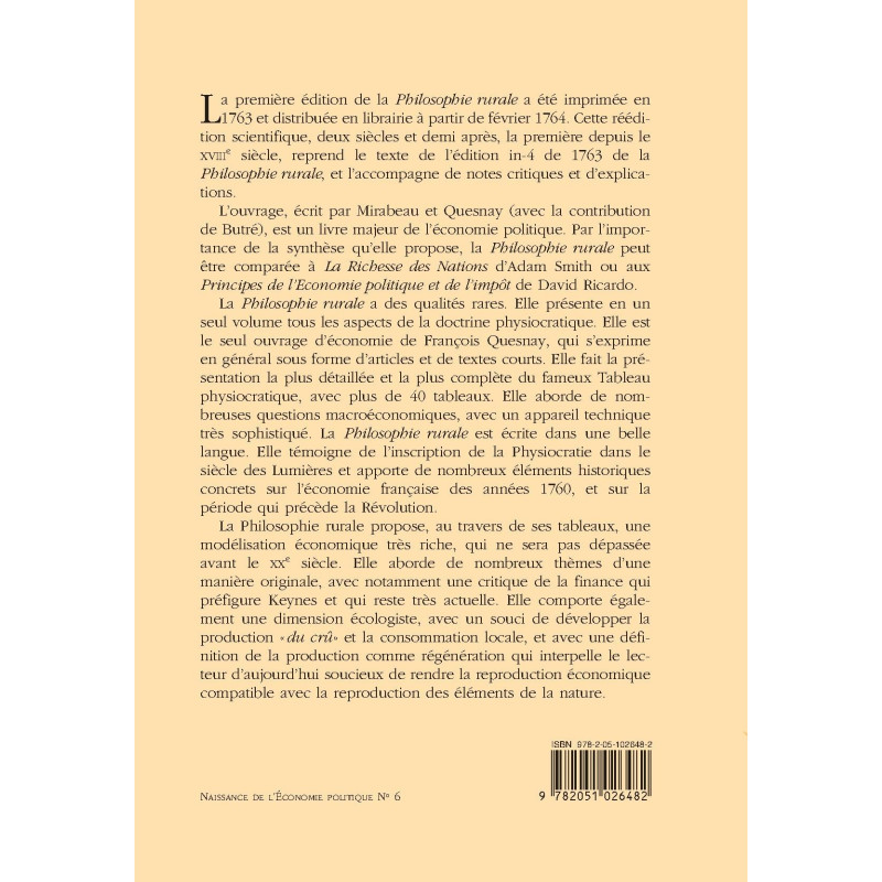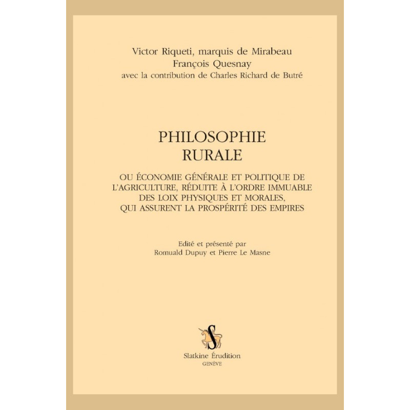 La première édition de la Philosophie rurale a été imprimée en 1763 et distribuée en librairie à partir de février 1764. Cette réédition scientifique, deux siècles et demi après, la première depuis le XVIIIe siècle, reprend le texte de l’édition in-4 de 1763 de la Philosophie rurale, et l’accompagne de notes critiques et d’explications.