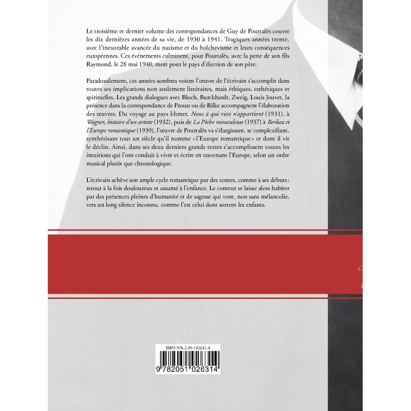 Le troisième et dernier volume des correspondances de Guy de Pourtalès couvre les dix dernières années de sa vie, de 1930 à 1941. Tragiques années trente, avec l’inexorable avancée du nazisme et du bolchevisme et leurs conséquences européennes. Ces événements culminent, pour Pourtalès, avec la perte de son fils Raymond, le 28 mai 1940, mort pour le pays d’élection de son père.