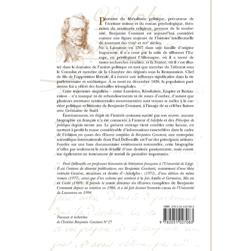 Étonnamment, en dépit de l’intérêt croissant suscité par son œuvre, aucune biographie en français n’a été consacrée à l’auteur d’Adolphe et des Principes de politique depuis trente ans. Le présent ouvrage vient combler cette lacune, en mettant à profit la masse considérable d’informations rassemblées dans le cadre de l’édition en cours des Œuvres complètes de Benjamin Constant, une entreprise scientifique internationale dont Paul Delbouille est l’un des principaux artisans. Fondée sur une base documentaire entièrement renouvelée, cette biographie n’offre pas seulement le récit détaillé d’une destinée passionnante, mais constitue également un instrument de travail de première importance.