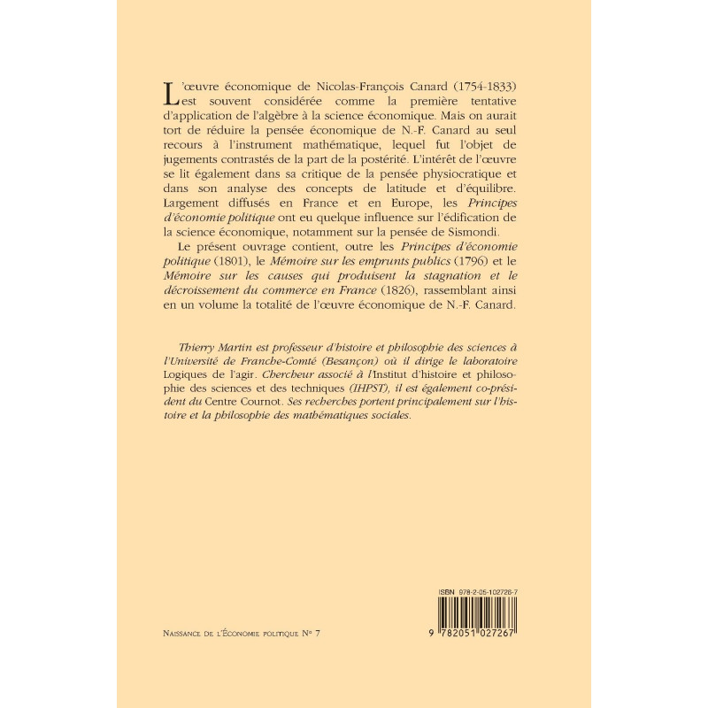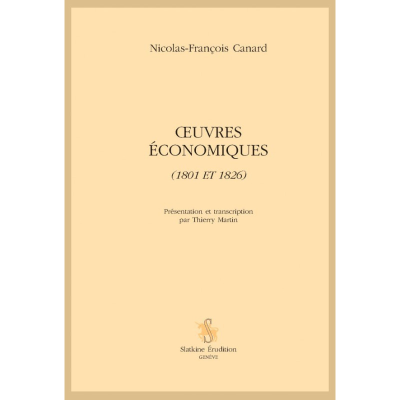L’œuvre économique de Nicolas-François Canard (1754-1833) est souvent considérée comme la première tentative d’application de l’algèbre à la science économique. Mais on aurait tort de réduire la pensée économique de N.-F. Canard au seul recours à l’instrument mathématique, lequel fut l’objet de jugements contrastés de la part de la postérité. L’intérêt de l’œuvre se lit également dans sa critique de la pensée physiocratique et dans son analyse des concepts de latitude et d’équilibre. Largement diffusés en France et en Europe, les Principes d’économie politique ont eu quelque influence sur l’édification de la science économique, notamment sur la pensée de Sismondi. Le présent ouvrage contient, outre les Principes d’économie politique (1801), le Mémoire sur les emprunts publics (1796) et le Mémoire sur les causes qui produisent la stagnation et le décroissement du commerce en France (1826), rassemblant ainsi en un volume la totalité de l’œuvre économique de N.-F. Canard.