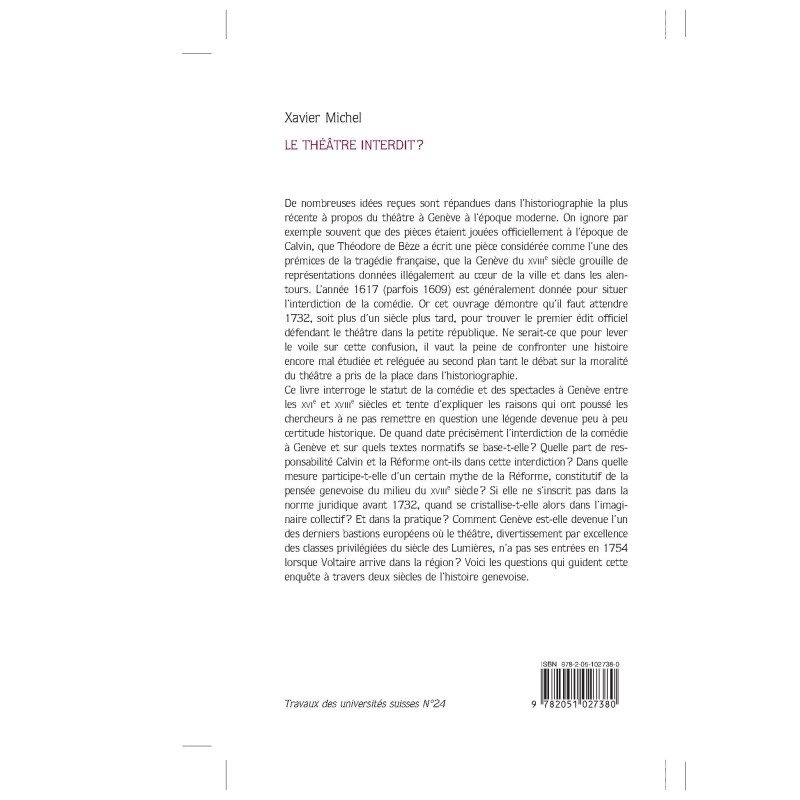Ce livre interroge le statut de la comédie et des spectacles à Genève entre les XVIe et XVIIIe siècles et tente d’expliquer les raisons qui ont poussé les chercheurs à ne pas remettre en question une légende devenue peu à peu certitude historique. De quand date précisément l’interdiction de la comédie à Genève et sur quels textes normatifs se base-t-elle ? Quelle part de responsabilité Calvin et la Réforme ont-ils dans cette interdiction ? Dans quelle mesure participe-t-elle d’un certain mythe de la Réforme, constitutif de la pensée genevoise du milieu du XVIIIe siècle ? Si elle ne s’inscrit pas dans la norme juridique avant 1732, quand se cristallise-t-elle alors dans l’imaginaire collectif ? Et dans la pratique ? Comment Genève est-elle devenue l’un des derniers bastions européens où le théâtre, divertissement par excellence des classes privilégiées du siècle des Lumières, n’a pas ses entrées en 1754 lorsque Voltaire arrive dans la région ? Voici les questions qui guident cette enquête à travers deux siècles de l’histoire genevoise.