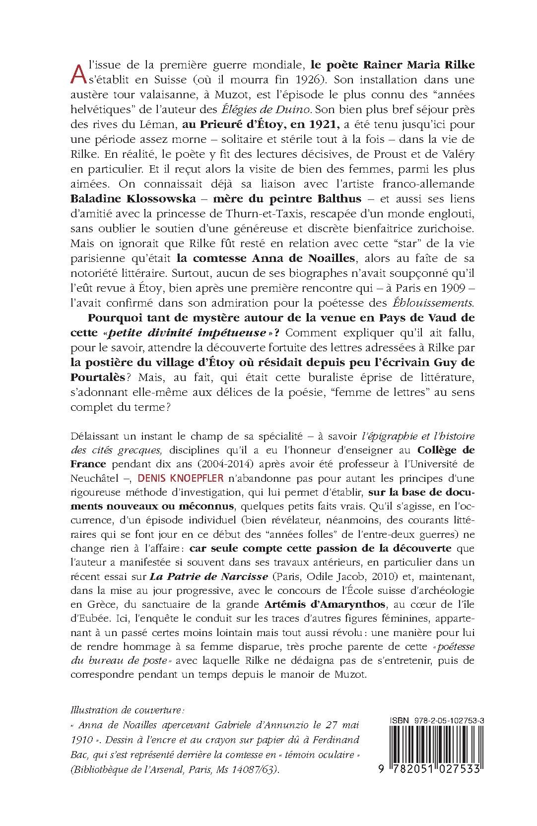 Délaissant un instant le champ de sa spécialité – à savoir l’épigraphie et l’histoire des cités grecques, disciplines qu’il a eu l’honneur d’enseigner au Collège de France pendant dix ans (2004-2014) après avoir été professeur à l’Université de Neuchâtel –, DENIS KNOEPFLER n’abandonne pas pour autant les principes d’une rigoureuse méthode d’investigation, qui lui permet d’établir, sur la base de documents nouveaux ou méconnus, quelques petits faits vrais. Qu’il s’agisse, en l’occurrence, d’un épisode individuel (bien révélateur, néanmoins, des courants littéraires qui se font jour en ce début des “années folles” de l’entre-deux guerres) ne change rien à l’affaire : car seule compte cette passion de la découverte que l’auteur a manifestée si souvent dans ses travaux antérieurs, en particulier dans un récent essai sur La Patrie de Narcisse (Paris, Odile Jacob, 2010) et, maintenant, dans la mise au jour progressive, avec le concours de l’École suisse d’archéologie en Grèce, du sanctuaire de la grande Artémis d’Amarynthos, au cœur de l’île d’Eubée. Ici, l’enquête le conduit sur les traces d’autres figures féminines, appartenant à un passé certes moins lointain mais tout aussi révolu : une manière pour lui de rendre hommage à sa femme disparue, très proche parente de cette « poétesse du bureau de poste » avec laquelle Rilke ne dédaigna pas de s’entretenir, puis de correspondre pendant un temps depuis le manoir de Muzot.