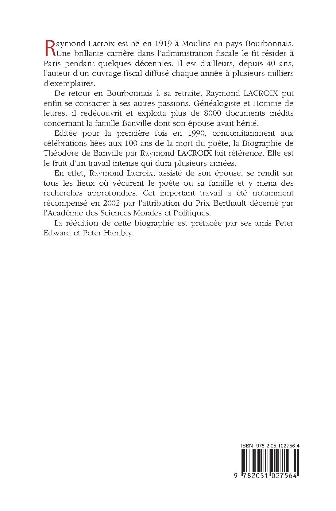 Editée pour la première fois en 1990, concomitamment aux célébrations liées aux 100 ans de la mort du poète, la Biographie de Théodore de Banville par Raymond Lacroix fait référence. Elle est le fruit d'un travail intense qui dura plusieurs années.