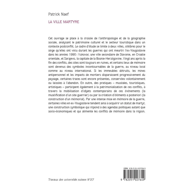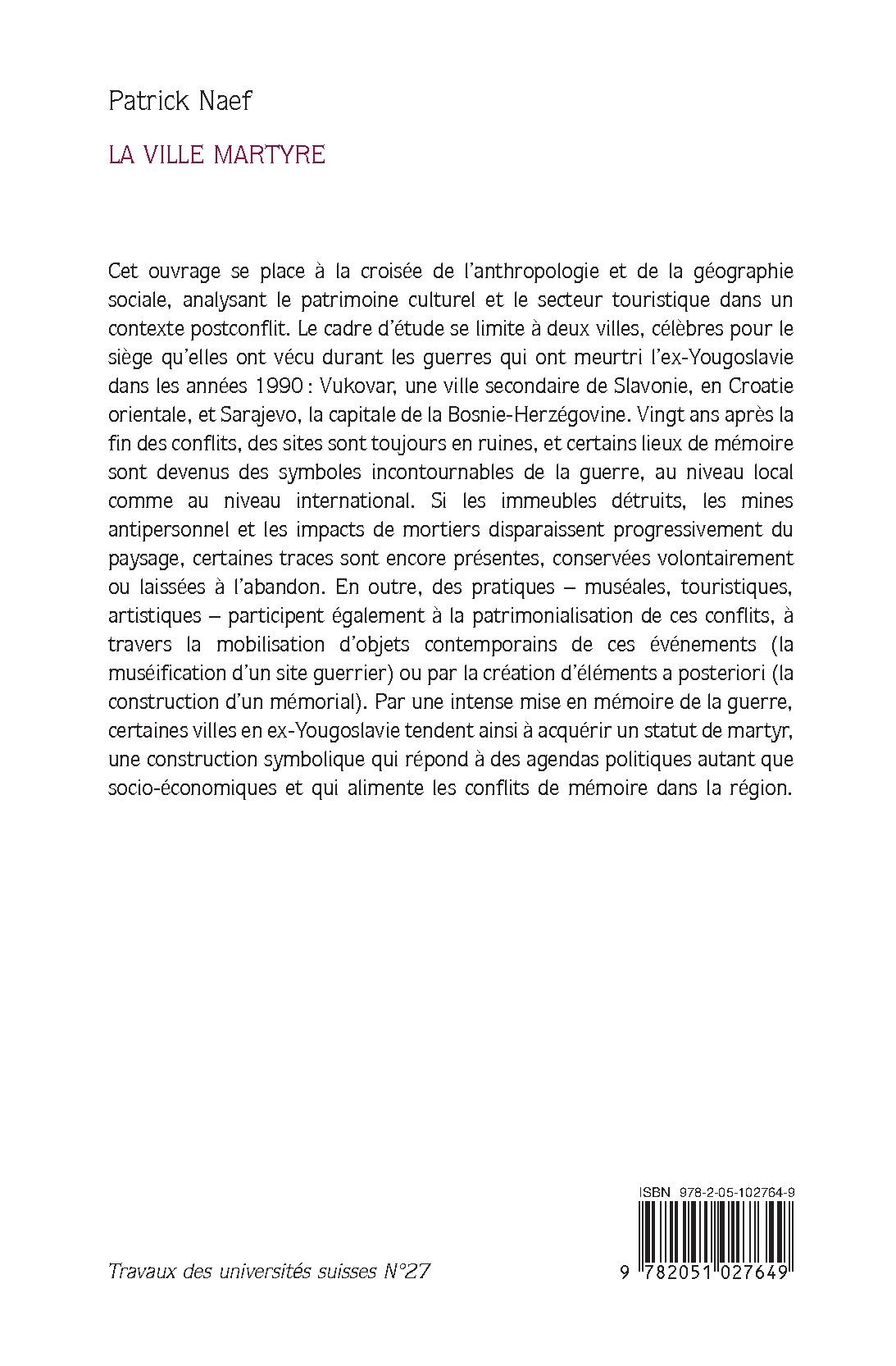 Cet ouvrage se place à la croisée de l’anthropologie et de la géographie sociale, analysant le patrimoine culturel et le secteur touristique dans un contexte postconflit. Le cadre d’étude se limite à deux villes, célèbres pour le siège qu’elles ont vécu durant les guerres qui ont meurtri l’ex-Yougoslavie dans les années 1990 : Vukovar, une ville secondaire de Slavonie, en Croatie orientale, et Sarajevo, la capitale de la Bosnie-Herzégovine. Vingt ans après la fin des conflits, des sites sont toujours en ruines, et certains lieux de mémoire sont devenus des symboles incontournables de la guerre, au niveau local comme au niveau international. Si les immeubles détruits, les mines antipersonnel et les impacts de mortiers disparaissent progressivement du paysage, certaines traces sont encore présentes, conservées volontairement ou laissées à l’abandon. En outre, des pratiques – muséales, touristiques, artistiques – participent également à la patrimonialisation de ces conflits, à travers la mobilisation d’objets contemporains de ces événements (la muséification d’un site guerrier) ou par la création d’éléments a posteriori (la construction d’un mémorial). Par une intense mise en mémoire de la guerre, certaines villes en ex-Yougoslavie tendent ainsi à acquérir un statut de martyr, une construction symbolique qui répond à des agendas politiques autant que socio-économiques et qui alimente les conflits de mémoire dans la région.