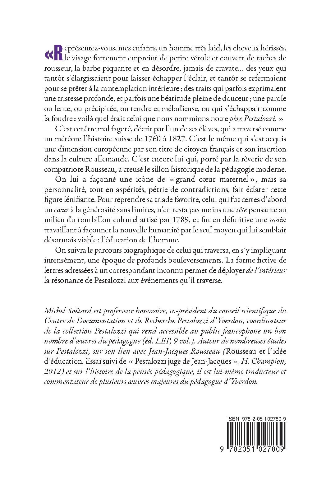 Michel Soëtard est professeur honoraire, co-président du conseil scientifique du Centre de Documentation et de Recherche Pestalozzi d’Yverdon, coordinateur de la collection Pestalozzi qui rend accessible au public francophone un bon nombre d’œuvres du pédagogue (éd. LEP, 9 vol.). Auteur de nombreuses études sur Pestalozzi, sur son lien avec Jean-Jacques Rousseau (Rousseau et l’idée d’éducation. Essai suivi de «Pestalozzi juge de Jean-Jacques», H. Champion, 2012) et sur l’histoire de la pensée pédagogique, il est lui-même traducteur et commentateur de plusieurs œuvres majeures du pédagogue d’Yverdon.
