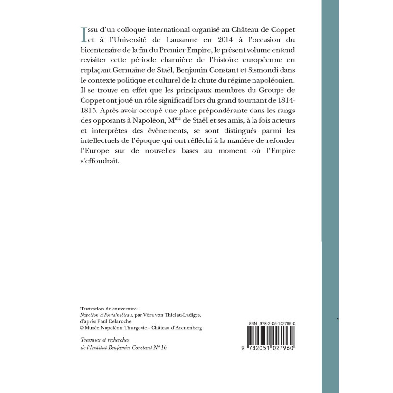 Issu d’un colloque international organisé au Château de Coppet et à l’Université de Lausanne en 2014 à l’occasion du bicentenaire de la fin du Premier Empire, le présent volume entend revisiter cette période charnière de l’histoire européenne en replaçant Germaine de Staël, Benjamin Constant et Sismondi dans le contexte politique et culturel de la chute du régime napoléonien. Il se trouve en effet que les principaux membres du Groupe de Coppet ont joué un rôle significatif lors du grand tournant de 1814-1815. Après avoir occupé une place prépondérante dans les rangs des opposants à Napoléon, Mme de Staël et ses amis, à la fois acteurs et interprètes des événements, se sont distingués parmi les intellectuels de l’époque qui ont réfléchi à la manière de refonder l’Europe sur de nouvelles bases au moment où l’Empire s’effondrait.