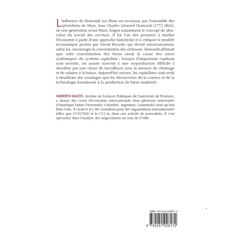 L’influence de Sismondi sur Marx est reconnue par l’ensemble des spécialistes de Marx. Jean Charles Léonard Sismondi (1773-1842), né une génération avant Marx, forgea notamment le concept de plus-value du travail des ouvriers. Il fut l’un des premiers à étudier l’économie à partir d’une approche historiciste et à critiquer le modèle économique promu par David Ricardo qui devait nécessairement, selon lui, encourager la concentration des richesses. Sismondi affirmait que cette concentration des biens serait la cause des crises systémiques du système capitaliste : lorsque d’importants capitaux sont investis, on assiste souvent à une surproduction difficile à absorber par une classe de travailleurs sous la menace du chômage et de salaires à la baisse. Aujourd’hui encore, les capitalistes sont seuls à bénéficier des avantages que les découvertes de la science et de la technologie fournissent à la production de biens matériels.