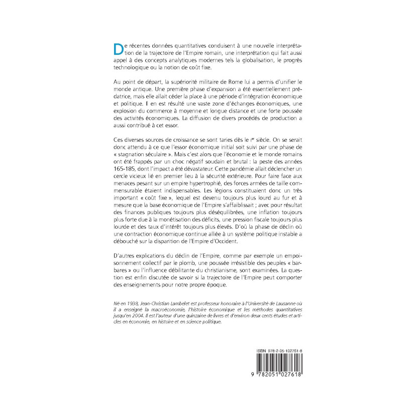 D’autres explications du déclin de l’Empire, comme par exemple un empoisonnement collectif par le plomb, une poussée irrésistible des peuples « barbares » ou l’influence débilitante du christianisme, sont examinées. La question est enfin discutée de savoir si la trajectoire de l’Empire peut comporter des enseignements pour notre propre époque.