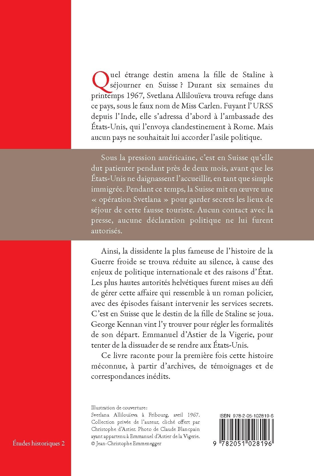 Ainsi, la dissidente la plus fameuse de l’histoire de la Guerre froide se trouva réduite au silence, à cause des enjeux de politique internationale et des raisons d’État. Les plus hautes autorités helvétiques furent mises au défi de gérer cette affaire qui ressemble à un roman policier, avec des épisodes faisant intervenir les services secrets. C’est en Suisse que le destin de la fille de Staline se joua. George Kennan vint l’y trouver pour régler les formalités de son départ. Emmanuel d’Astier de la Vigerie, pour tenter de la dissuader de se rendre aux États-Unis. Ce livre raconte pour la première fois cette histoire méconnue, à
