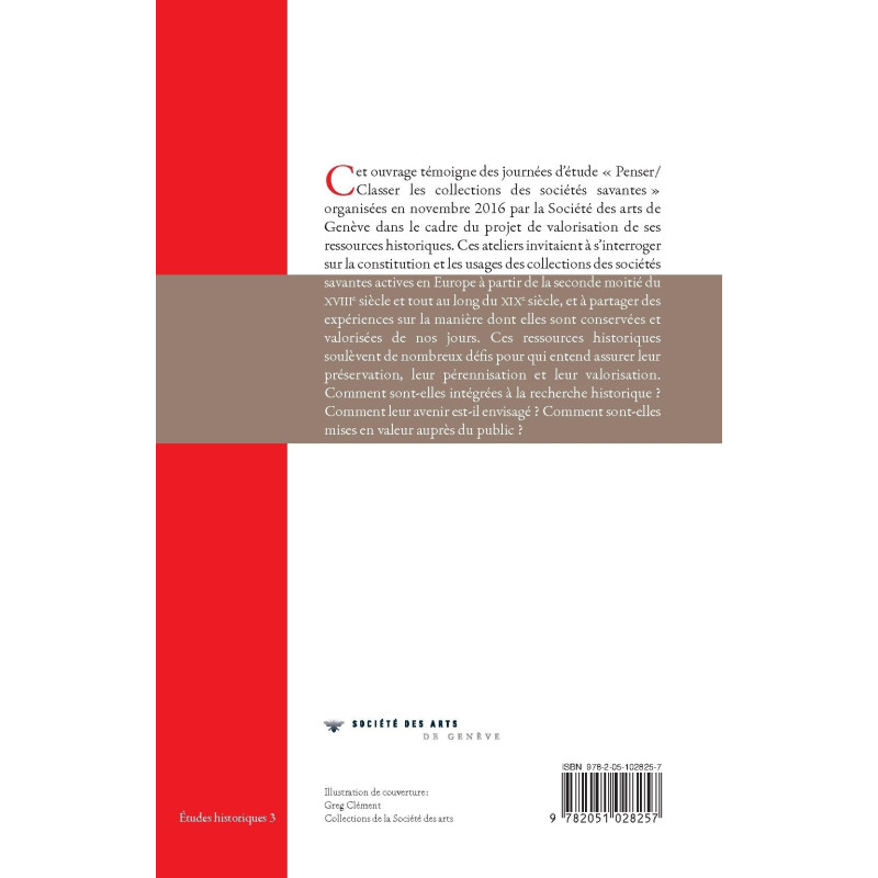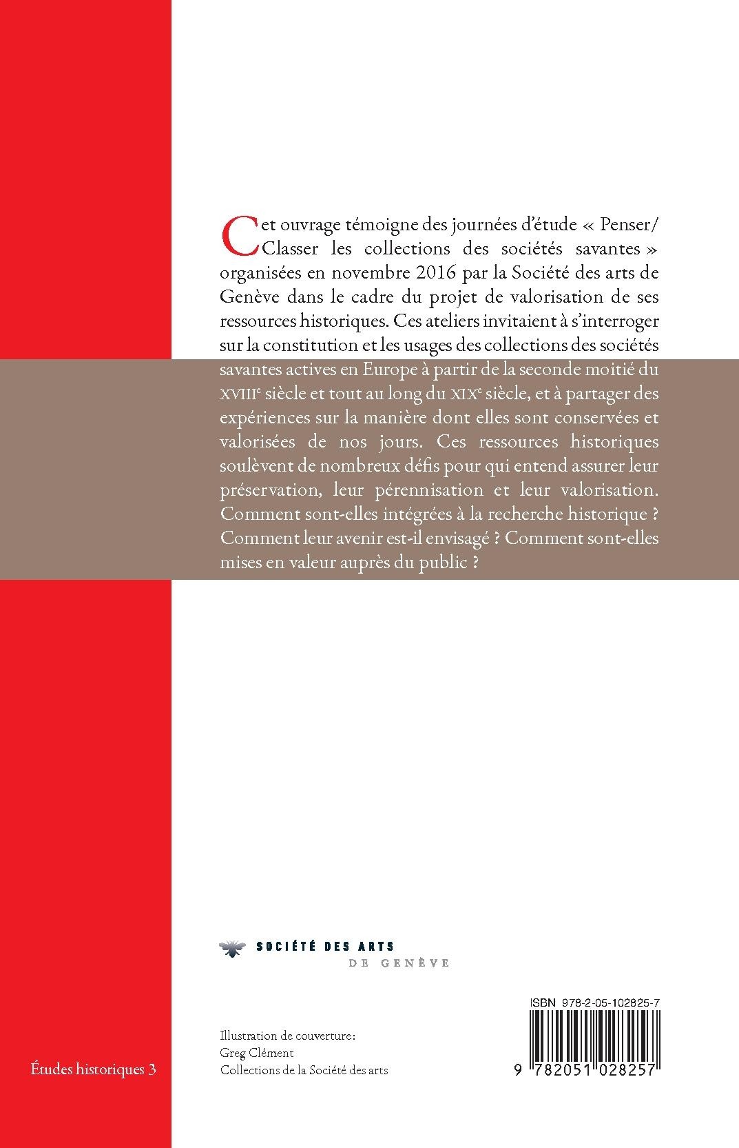 Cet ouvrage témoigne des journées d’étude « Penser/Classer les collections des sociétés savantes » organisées en novembre 2016 par la Société des arts de Genève dans le cadre du projet de valorisation de ses ressources historiques. Ces ateliers invitaient à s’interroger sur la constitution et les usages des collections des sociétés savantes actives en Europe à partir de la seconde moitié du XVIIIe siècle et tout au long du XIXe siècle, et à partager des expériences sur la manière dont elles sont conservées et valorisées de nos jours. Ces ressources historiques soulèvent de nombreux défis pour qui entend assurer leur préservation, leur pérennisation et leur valorisation.