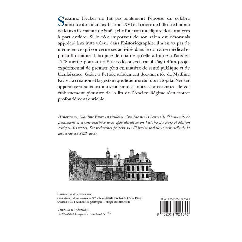 Suzanne Necker ne fut pas seulement l’épouse du célèbre ministre des finances de Louis XVI et la mère de l’illustre femme de lettres Germaine de Staël ; elle fut aussi une figure des Lumières à part entière. Si le rôle important de son salon est désormais apprécié à sa juste valeur dans l’historiographie, il n’en va pas de même en ce qui concerne ses activités dans le domaine médical et philanthropique. L’hospice de charité qu’elle a fondé à Paris en 1778 mérite pourtant d’être redécouvert, car il s’agit d’un projet expérimental de premier plan en matière de santé publique et de bienfaisance. Grâce à l’étude solidement documentée de Madline Favre, la création et la gestion quotidienne du futur Hôpital Necker apparaissent sous un nouveau jour, et notre connaissance de cet établissement pionnier de la fin de l’Ancien Régime s’en trouve profondément enrichie.