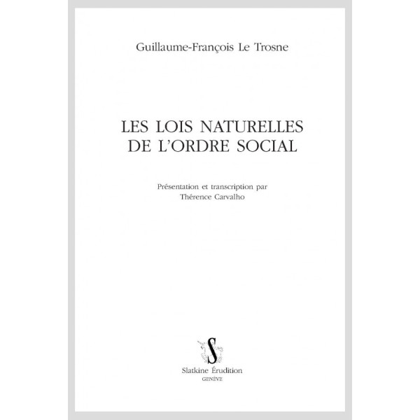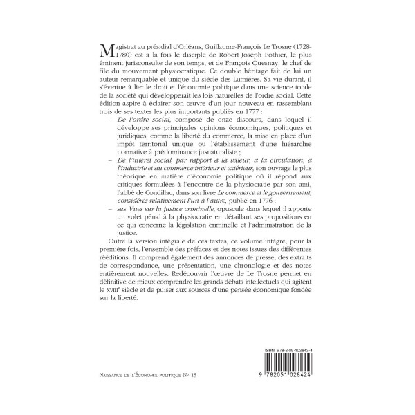 Magistrat au présidial d’Orléans, Guillaume-François Le Trosne (1728- 1780) est à la fois le disciple de Robert-Joseph Pothier, le plus éminent jurisconsulte de son temps, et de François Quesnay, le chef de file du mouvement physiocratique. Ce double héritage fait de lui un auteur remarquable et unique du siècle des Lumières. Sa vie durant, il s’évertue à lier le droit et l’économie politique dans une science totale de la société qui développerait les lois naturelles de l’ordre social. Cette édition aspire à éclairer son oeuvre d’un jour nouveau en rassemblant trois de ses textes les plus importants publiés en 1777 :