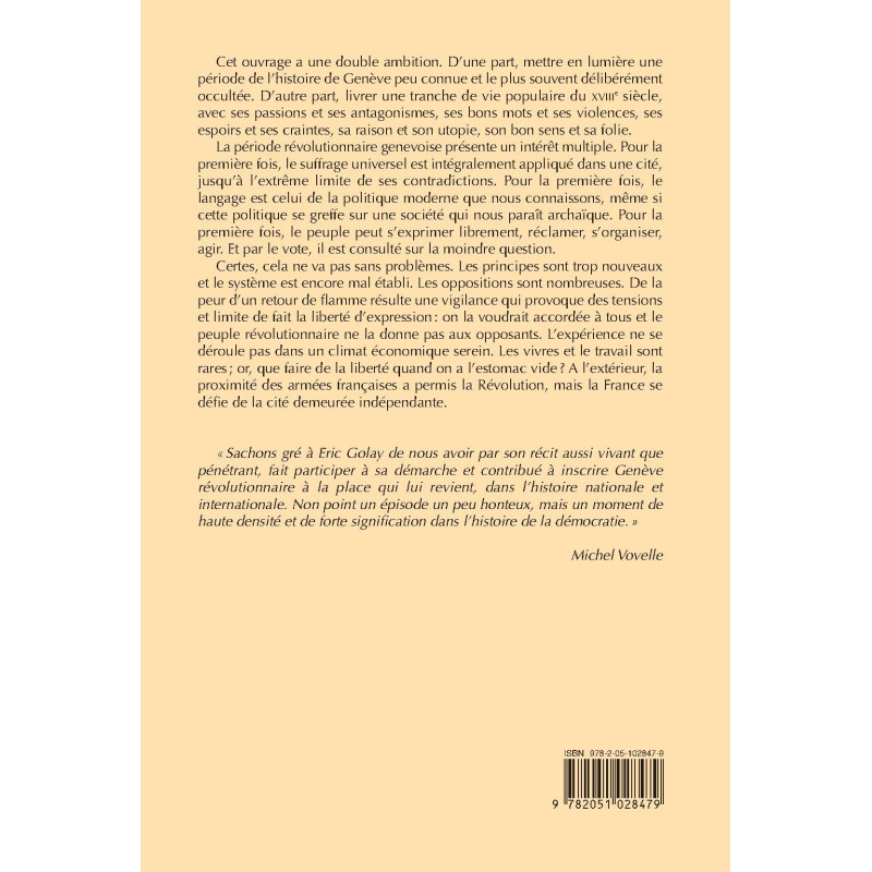 « Sachons gré à Eric Golay de nous avoir par son récit aussi vivant que pénétrant, fait participer à sa démarche et contribué à inscrire Genève révolutionnaire à la place qui lui revient, dans l’histoire nationale et internationale. Non point un épisode un peu honteux, mais un moment de haute densité et de forte signification dans l’histoire de la démocratie. » Michel Vovelle