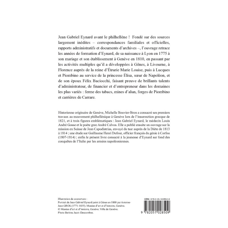 Jean Gabriel Eynard avant le philhellène ! Fondé sur des sources largement inédites – correspondances familiales et officielles, rapports administratifs et documents d’archives –, l’ouvrage retrace les années de formation d’Eynard, de sa naissance à Lyon en 1775 à son mariage et son établissement à Genève en 1810, en passant par les activités multiples qu’il a développées à Gênes, à Livourne, à Florence auprès de la reine d’Étrurie Marie Louise, puis à Lucques et Piombino au service de la princesse Élisa, soeur de Napoléon, et de son époux Félix Baciocchi, faisant preuve de brillants talents d’administrateur, de financier et d’entrepreneur dans les domaines les plus variés: ferme des tabacs, mines d’alun, forges de Piombino et carrières de Carrare.