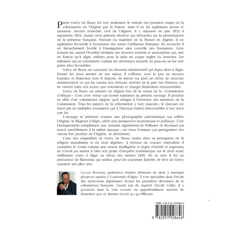 Genty de Bussy est conscient du désordre administratif qui règne alors à Alger. Durant les deux années de son séjour, il s’efforce, avec le peu de moyens humains et financiers dont il dispose, de mettre sur pied un début de structure administrative ce qui lui vaudra des critiques acerbes de la part des libéraux qui ne verront dans son action que contraintes et charges financières insoutenables. Genty de Bussy est présent en Algérie lors de la venue de la « Commission d’Afrique ». C’est cette venue qui donne naissance au présent ouvrage. Il procède en effet d’un volumineux rapport qu’il rédigea à l’attention des membres de la Commission. Tous les aspects de la colonisation y sont exposés ; le discours est étayé par de multiples documents qui à l’époque étaient inaccessibles à tout autre que lui.