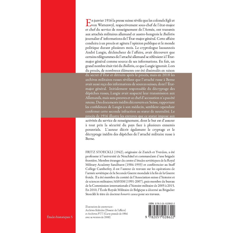En janvier 1916 la presse suisse révèle que les colonels Egli et von Wattenwyl, respectivement sous-chef de l’état-major et chef du service de renseignement de l’Armée, ont transmis aux attachés militaires allemand et austro-hongrois le Bulletin journalier d’informations de l’État-major général. Cette affaire conduira à un procès et agitera l’opinion publique et le monde politique durant plusieurs mois. Le cryptologue lausannois André Langie, déclencheur de l’affaire, avait découvert que certains télégrammes de l’attaché allemand se référaient à l’État-major général comme source de ses informations. En fait, un grand nombre était tiré du Bulletin, ce que Langie ignorait. Lors du procès, de nombreux éléments ont été dissimulés en raison du secret d’État et détruits après le procès, mais en 2018 les archives militaires russes révèlent que l’attaché russe à Berne avait aussi reçu des informations de sources suisses, dont l’État-major général. Initialement responsable du décryptage des dépêches russes, Langie avait suspecté leur transmission aux Allemands, mais sans preuves et ce chef d’accusation n’a pas été retenu. Des documents inédits découverts en Suisse, rapportant les confidences de Langie à son médecin, semblent cependant confirmer cette seconde infraction au statut de neutralité. Le procès de 1916 illustre les entraves que ce statut impose aux activités du service de renseignement, dont le but est d’assurer à tout prix la sécurité du pays face à plusieurs ennemis potentiels. L’auteur décrit également le cryptage et le décryptage inédits des dépêches de l’attaché militaire russe à Berne.