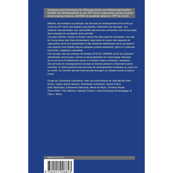 Cet ouvrage, issu du colloque de Genève 2018 de l’ASHSM, porte sur plusieurs thématiques méconnues, comme le développement de l’espionnage allemand sur le sol de la Confédération après la Première Guerre mondiale, l’existence des services de renseignement polonais en Suisse pendant la Seconde Guerre mondiale, le fonctionnement des services de renseignement helvétique au cours de ce conflit, ou l’activité des services secrets étrangers en Suisse durant la Guerre froide.
