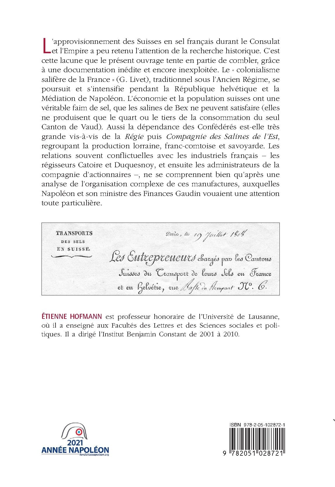L’approvisionnement des Suisses en sel français durant le Consulat et l’Empire a peu retenu l’attention de la recherche historique. C’est cette lacune que le présent ouvrage tente en partie de combler, grâce à une documentation inédite et encore inexploitée. Le « colonialisme salifère de la France » (G. Livet), traditionnel sous l’Ancien Régime, se poursuit et s’intensifie pendant la République helvétique et la Médiation de Napoléon. L’économie et la population suisses ont une véritable faim de sel, que les salines de Bex ne peuvent satisfaire (elles ne produisent que le quart ou le tiers de la consommation du seul Canton de Vaud). Aussi la dépendance des Confédérés est-elle très grande vis-à-vis de la Régie puis Compagnie des Salines de l’Est, regroupant la production lorraine, franc-comtoise et savoyarde. Les relations souvent conflictuelles avec les industriels français – les régisseurs Catoire et Duquesnoy, et ensuite les administrateurs de la compagnie d’actionnaires –, ne se comprennent bien qu’après une analyse de l’organisation complexe de ces manufactures, auxquelles Napoléon et son ministre des Finances Gaudin vouaient une attention toute particulière.
