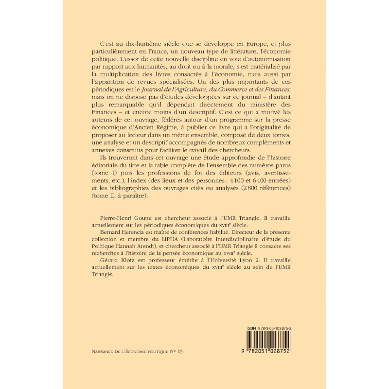 C’est au dix-huitième siècle que se développe en Europe, et plus particulièrement en France, un nouveau type de littérature, l’économie politique. L’essor de cette nouvelle discipline en voie d’autonomisation par rapport aux humanités, au droit ou à la morale, s’est matérialisé par la multiplication des livres consacrés à l’économie, mais aussi par l’apparition de revues spécialisées. Un des plus importants de ces périodiques est le Journal de l’Agriculture, du Commerce et des Finances, mais on ne dispose pas d’études développées sur ce journal – d’autant plus remarquable qu’il dépendait directement du ministère des Finances – et encore moins d’un descriptif. C’est ce qui a motivé les auteurs de cet ouvrage, fédérés autour d’un programme sur la presse économique d’Ancien Régime, à publier ce livre qui a l’originalité de proposer au lecteur dans un même ensemble, composé de deux tomes, une analyse et un descriptif accompagnés de nombreux compléments et annexes construits pour faciliter le travail des chercheurs.