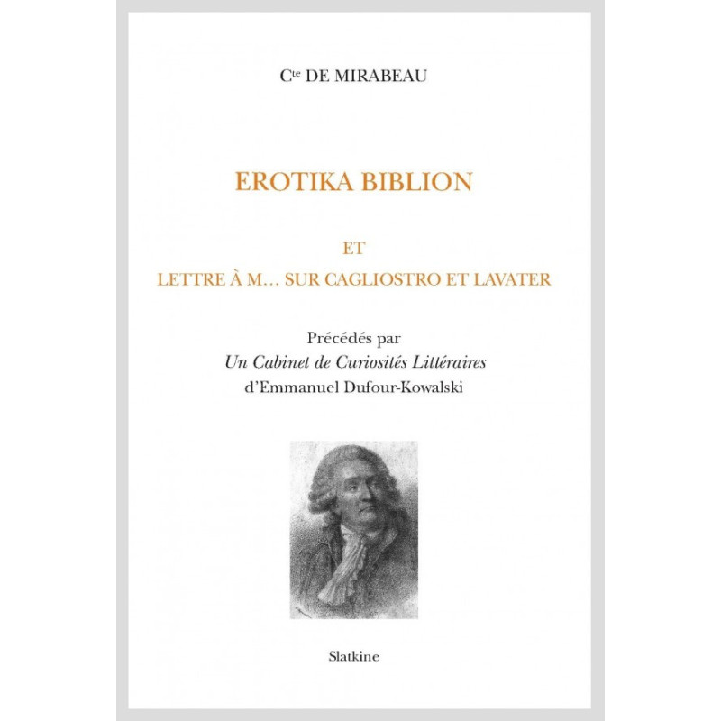 La réédition de l’Erotika Biblion doit être saluée comme un petit événement pour le dixième anniversaire de la Collection Nouvelle Bibliothèque Initiatique Slatkine, Série 2, n°12. Elle a pour motif essentiel la reviviscence d’un texte très particulier de Gabriel- Honoré Riquetti, Cte de Mirabeau (1749-1791), qui mélange plusieurs disciplines des sciences humaines.