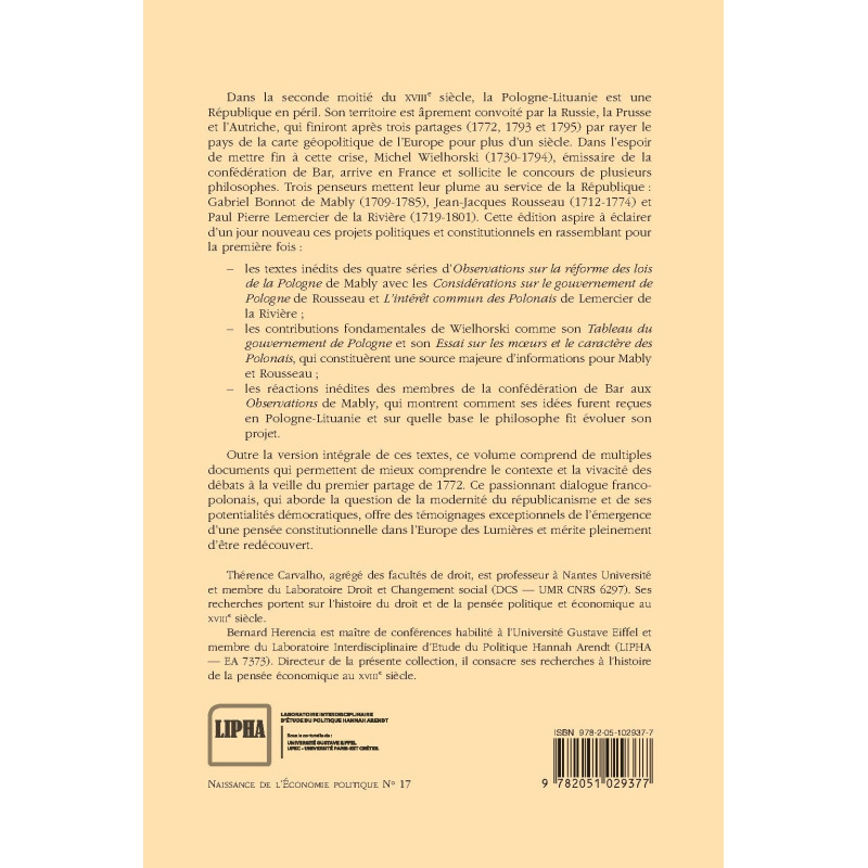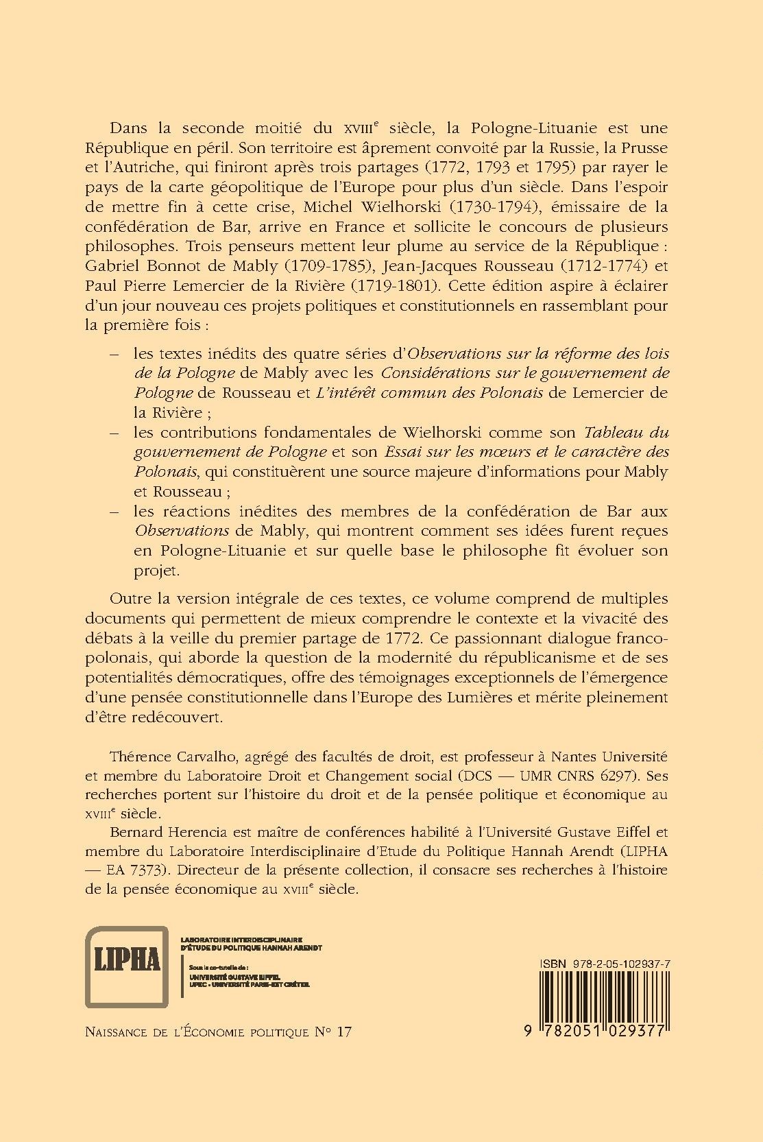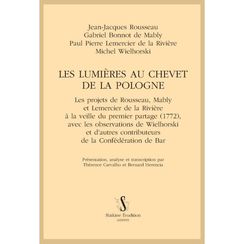 Dans la seconde moitié du XVIIIe siècle, la Pologne-Lituanie est une République en péril. Son territoire est âprement convoité par la Russie, la Prusse et l’Autriche, qui finiront après trois partages (1772, 1793 et 1795) par rayer le pays de la carte géopolitique de l’Europe pour plus d’un siècle. Dans l’espoir de mettre fin à cette crise, Michel Wielhorski (1730-1794), émissaire de la confédération de Bar, arrive en France et sollicite le concours de plusieurs philosophes. Trois penseurs mettent leur plume au service de la République : Gabriel Bonnot de Mably (1709-1785), Jean-Jacques Rousseau (1712-1774) et Paul Pierre Lemercier de la Rivière (1719-1801). Cette édition aspire à éclairer d’un jour nouveau ces projets politiques et constitutionnels en rassemblant pour la p remière fois :