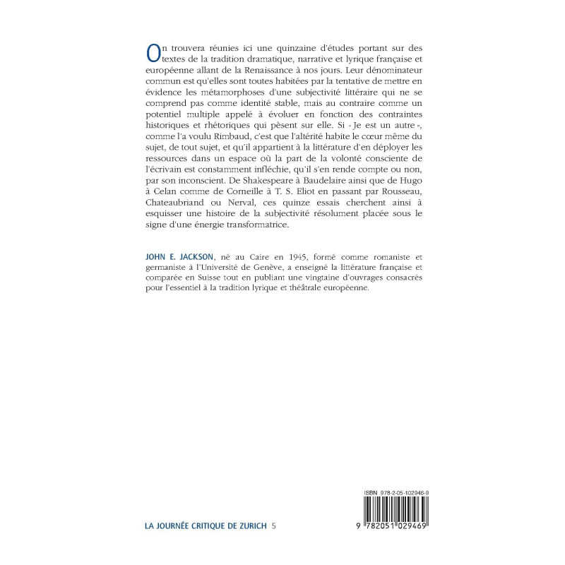 On trouvera réunies ici une quinzaine d’études portant sur des textes de la tradition dramatique, narrative et lyrique française et européenne allant de la Renaissance à nos jours. Leur dénominateur commun est qu’elles sont toutes habitées par la tentative de mettre en évidence les métamorphoses d’une subjectivité littéraire qui ne se comprend pas comme identité stable, mais au contraire comme un potentiel multiple appelé à évoluer en fonction des contraintes historiques et rhétoriques qui pèsent sur elle. Si « Je est un autre », comme l’a voulu Rimbaud, c’est que l’altérité habite le coeur même du sujet, de tout sujet, et qu’il appartient à la littérature d’en déployer les ressources dans un espace où la part de la volonté consciente de l’écrivain est constamment infléchie, qu’il s’en rende compte ou non, par son inconscient. De Shakespeare à Baudelaire ainsi que de Hugo à Celan comme de Corneille à T. S. Eliot en passant par Rousseau, Chateaubriand ou Nerval, ces quinze essais cherchent ainsi à esquisser une histoire de la subjectivité résolument placée sous le signe d’une énergie transformatrice.
