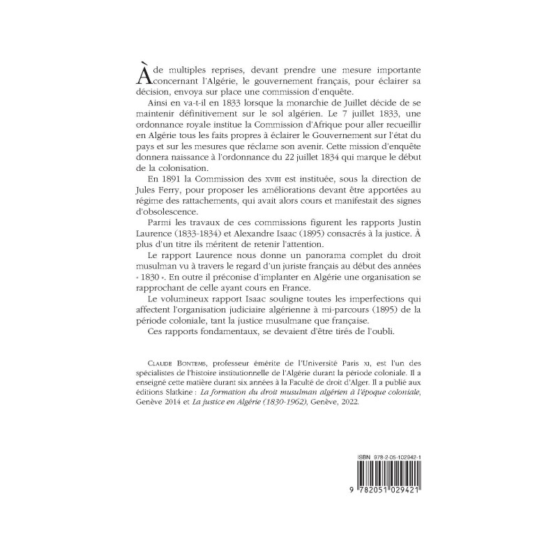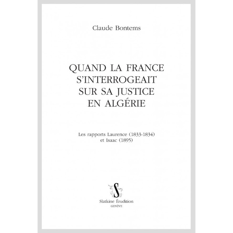 Claude Bontems, professeur émérite de l’Université Paris XI, est l’un des spécialistes de l’histoire institutionnelle de l’Algérie durant la période coloniale. Il a enseigné cette matière durant six années à la Faculté de droit d’Alger. Il a publié aux éditions Slatkine : La formation du droit musulman algérien à l’époque coloniale, Genève, 2014 et La justice en Algérie (1830-1962), Genève, 2022.