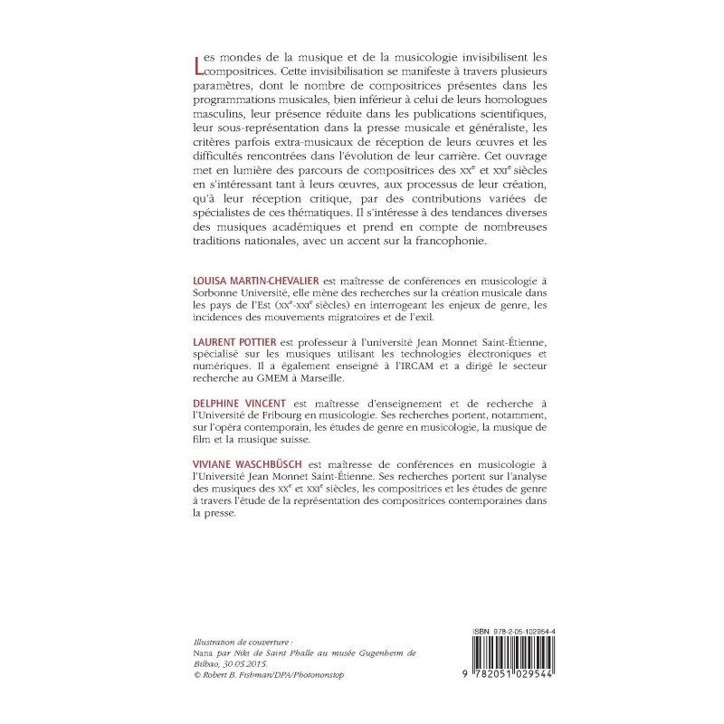 Les mondes de la musique et de la musicologie invisibilisent les compositrices. Cette invisibilisation se manifeste à travers plusieurs paramètres, dont le nombre de compositrices présentes dans les programmations musicales, bien inférieur à celui de leurs homologues masculins, leur présence réduite dans les publications scientifiques, leur sous-représentation dans la presse musicale et généraliste, les critères parfois extra-musicaux de réception de leurs œuvres et les difficultés rencontrées dans l’évolution de leur carrière. Cet ouvrage met en lumière des parcours de compositrices des XXe et XXIe siècles en s’intéressant tant à leurs œuvres, aux processus de leur création, qu’à leur réception critique, par des contributions variées de spécialistes de ces thématiques. Il s’intéresse à des tendances diverses des musiques académiques et prend en compte de nombreuses traditions nationales, avec un accent sur la francophonie.