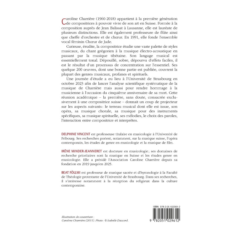 Caroline Charrière (1960-2018) appartient à la première génération de compositrices à pouvoir vivre de son art en Suisse. Formée à la composition auprès de Jean Balissat à Lausanne, elle est lauréate de plusieurs distinctions. Elle est également professeure de flûte ainsi que cheffe d’orchestre et de choeur.