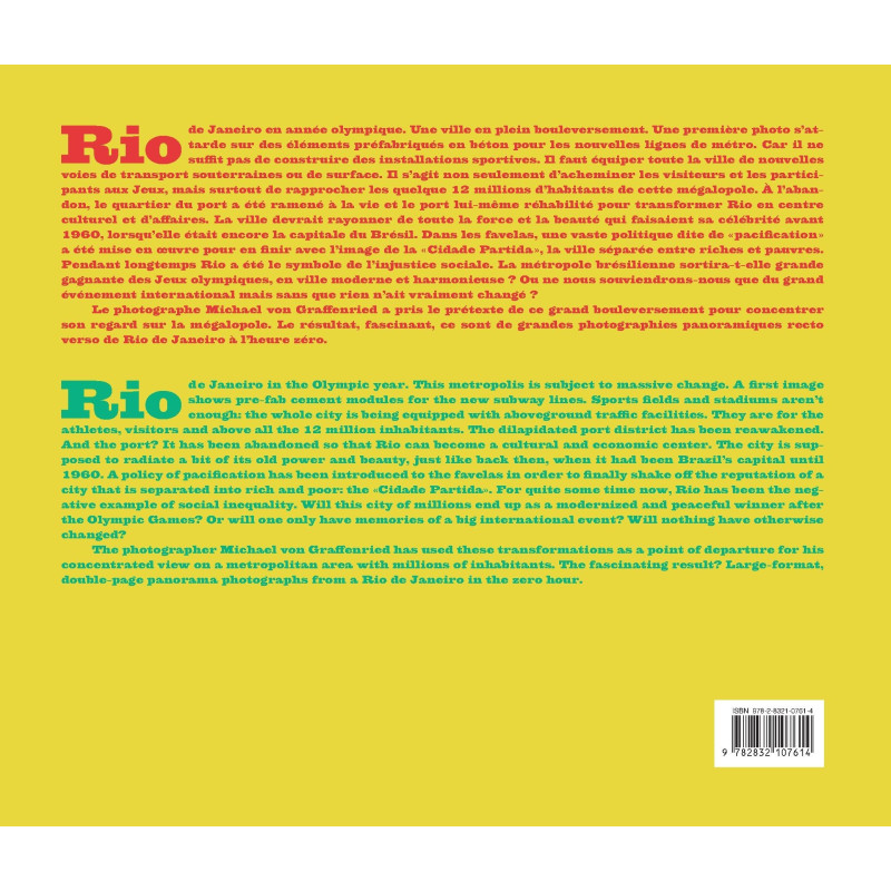 Rio de Janeiro in the Olympic year. This metropolis is subject to massive change. A first image shows pre-fab cement modules for the new subway lines. Sports fields and stadiums aren’t enough: the whole city is being equipped with aboveground traffic facilities. They are for the athletes, visitors and above all the 12 million inhabitants. The dilapidated port district has been reawakened. And the port? It has been abandoned so that Rio can become a cultural and economic center. The city is supposed to radiate a bit of its old power and beauty, just like back then, when it had been Brazil’s capital until 1960. A policy of pacification has been introduced to the favelas in order to finally shake off the reputation of a city that is separated into rich and poor: the «Cidade Partida». For quite some time now, Rio has been the negative example of social inequality. Will this city of millions end up as a modernized and peaceful winner after the Olympic Games? Or will one only have memories of a big international event? Will nothing have otherwise changed? The photographer Michael von Graffenried has used these transformations as a point of departure for his concentrated view on a metropolitan area with millions of inhabitants. The fascinating result? Large-format, double-page panorama photographs from a Rio de Janeiro in the zero hour.
