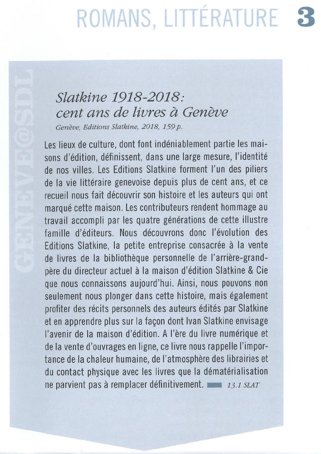 Slatkine fête en cette année 2018 ses cent ans ! Cent ans de livres à Genève, quatre générations au service du livre.