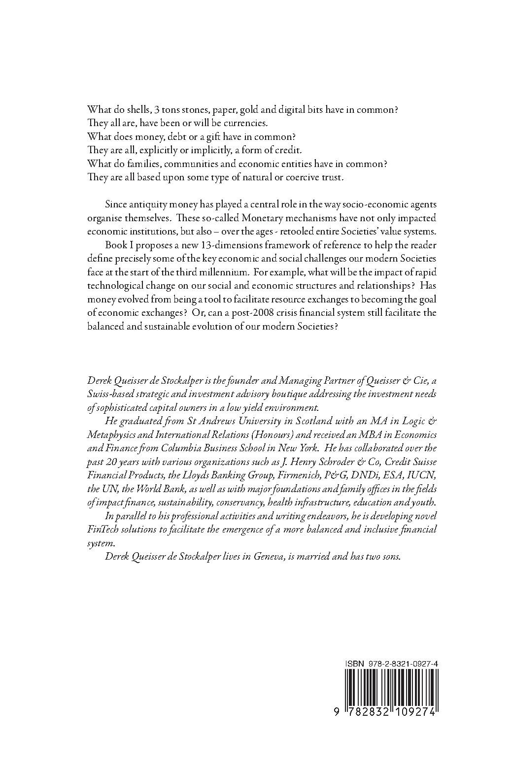 Since antiquity money has played a central role in the way socio-economic agents organise themselves. These so-called Monetary mechanisms have not only impacted economic institutions, but also – over the ages - retooled entire Societies’ alue systems. Book I proposes a new 13-dimensions framework of reference to help the reader define precisely some of the key economic and social challenges our modern Societies face at the start of the third millennium. For example, what will be the impact of rapid technological change on our social and economic structures and relationships? Has money evolved from being a tool to facilitate resource exchanges to ecoming the goal of economic exchanges? Or, can a post-2008 crisis financial system still facilitate the balanced and sustainable evolution of our modern Societies?