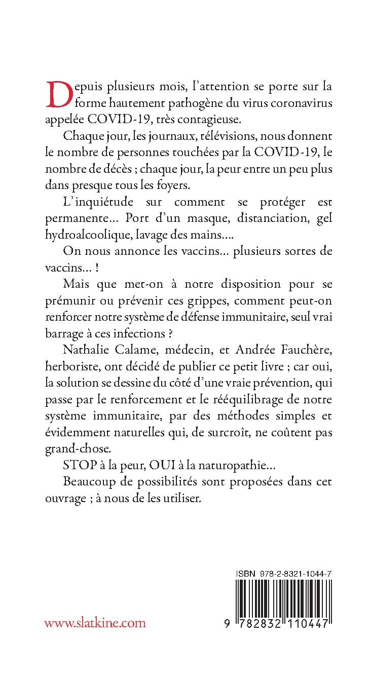 Nathalie Calame, médecin, et Andrée Fauchère, herboriste, ont décidé de publier ce petit livre ; car oui, la solution se dessine du côté d’une vraie prévention, qui passe par le renforcement et le rééquilibrage de notre système immunitaire, par des méthodes simples et évidemment naturelles qui, de surcroît, ne coûtent pas