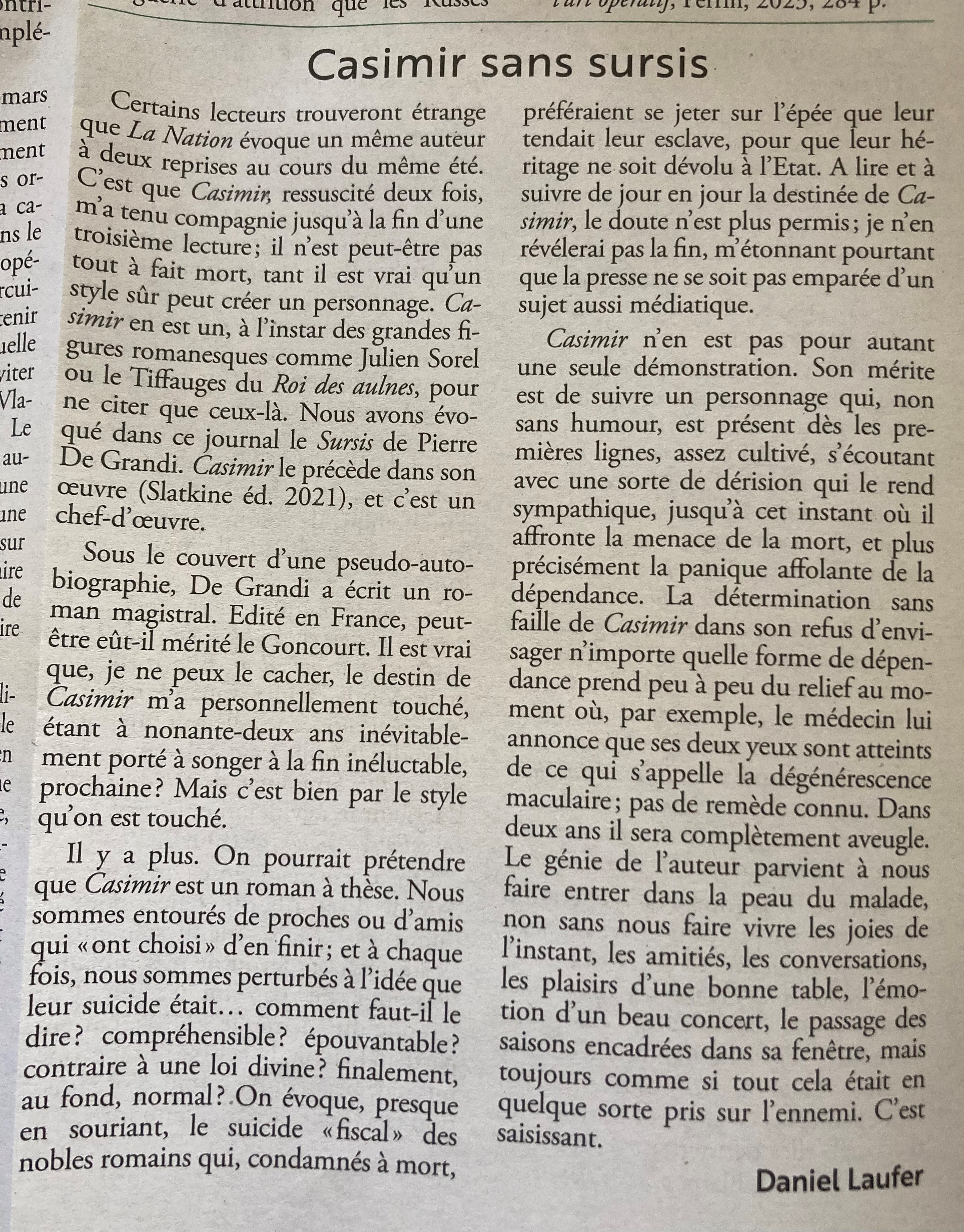 N’étant atteint d’aucune maladie mortelle, il se sait pourtant souffrant de divers maux qui le mèneront inévitablement à la perte de son indépendance. Or Casimir refuse catégoriquement de finir sa vie dans une institution pour personnes dépendantes.