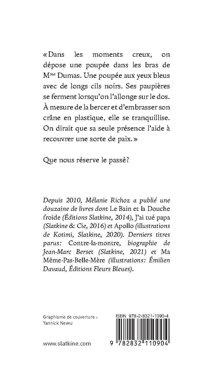 "Dans les moments creux, on dépose une poupée dans les bras de Mme Dumas. Une poupée aux yeux bleus avec de longs cils noirs. Ses paupières se ferment lorsqu’on l’allonge sur le dos. À mesure de la bercer et d’embrasser son crâne en plastique, elle se tranquillise. On dirait que sa seule présence l’aide à recouvrer une sorte de paix."