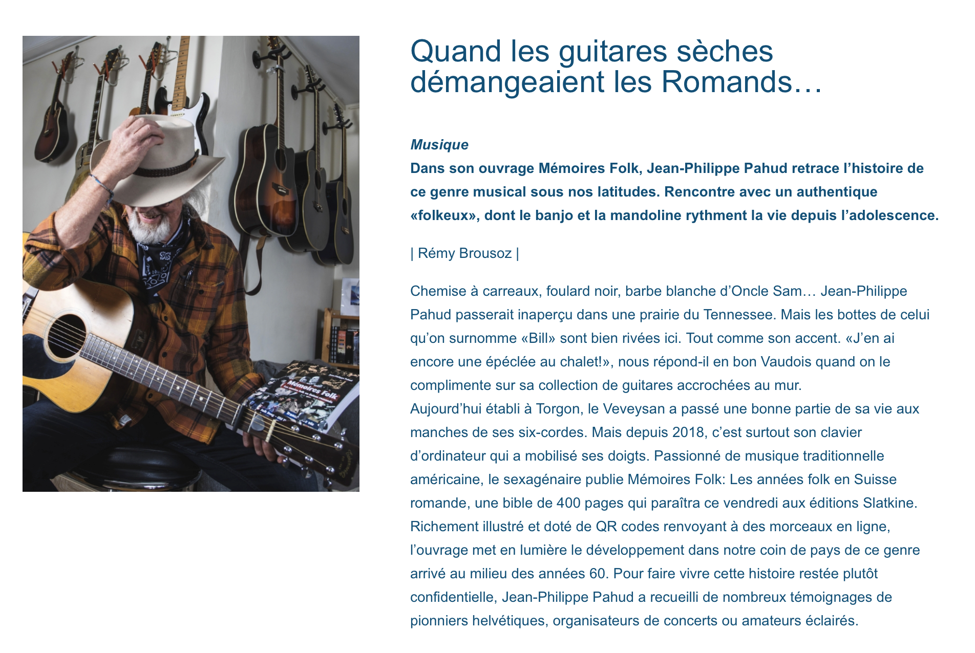 Jean-Philippe Pahud, 67 ans, aujourd’hui domicilié à Torgon en Valais. Enseignant professionnel retraité depuis peu, musicien country amateur depuis de nombreuses années et toujours actif au sein de deux groupes : New Country Rain et Bluegrass Parkway. A vécu de l’enfance à sa retraite sur la Riviera vaudoise entre Vevey et Montreux.